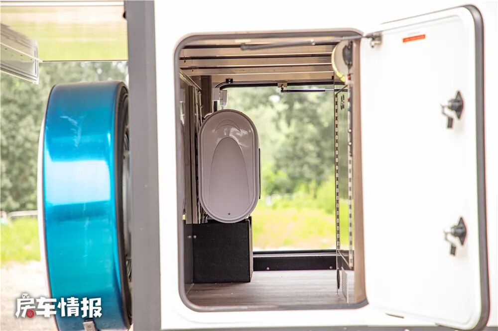 位于车身尾部还提供了一个内部空间不错的贯通式行李舱,便于把一些旅行中的行李设备存放其中,位于储物箱的外侧还设有照明灯和电动平衡支腿的调节开关。虽然储物箱的空间比较大,但是位于另一侧的热水器占用了一定空间,如果能换个位置就更好了。