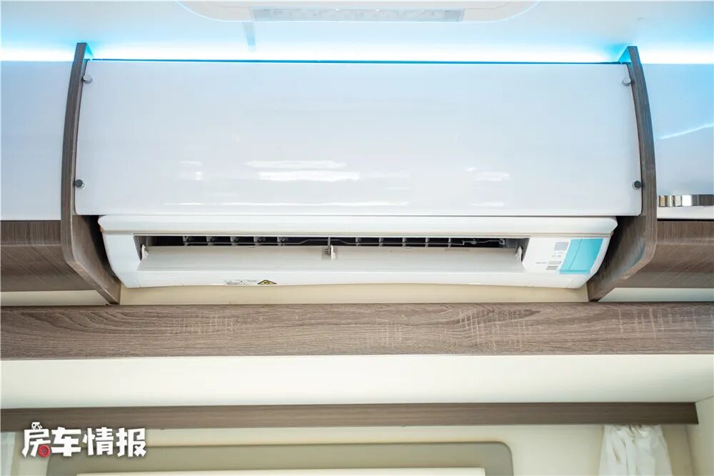 车厢尾部的拓展打开以后是一张横置双人床,尺寸挺大约为2200*1500mm,睡下2名成年人没问题。尾床顶部还提供了一台1.5P家用空调,位置比较居中,可以对车内实现快速调节温度,尾床底部提供了一台3公斤的大宇洗烘干一体机。