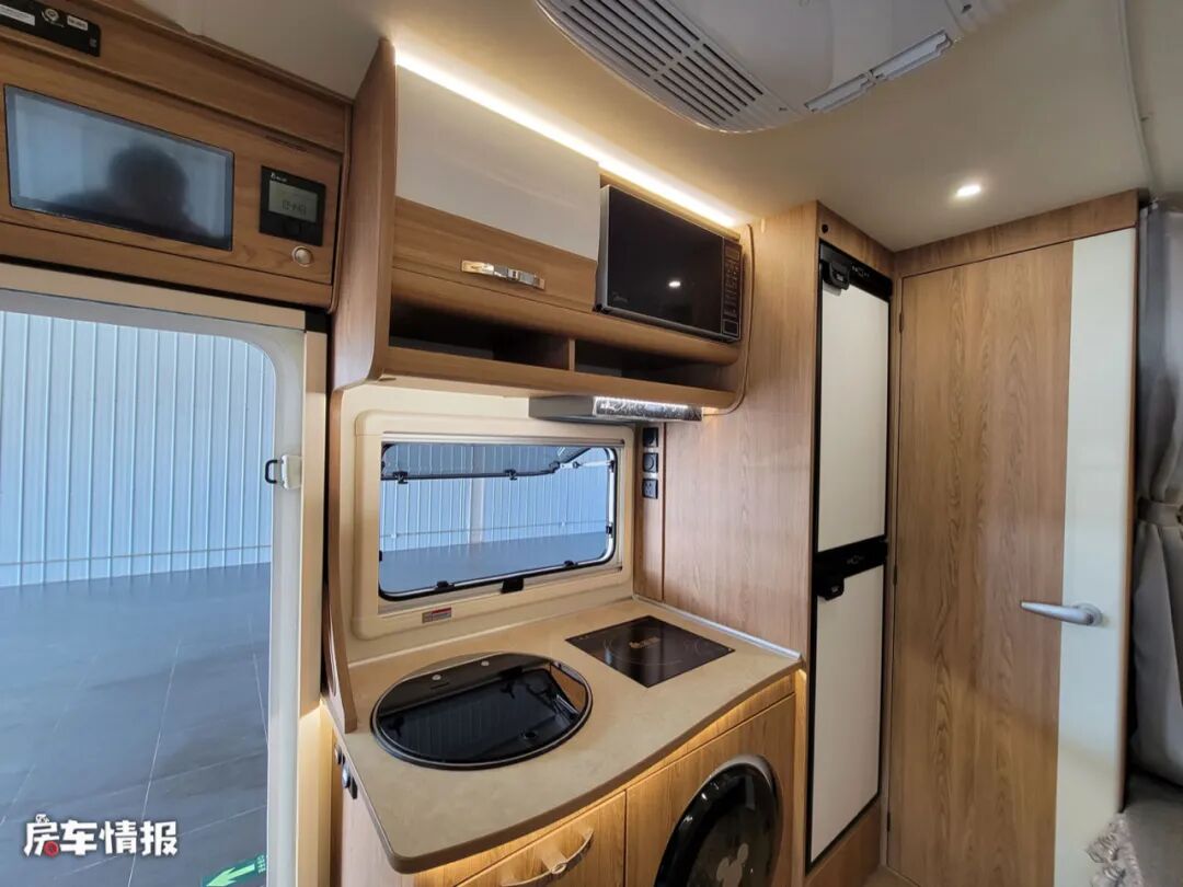乘客门后方为全车的厨房操作台,整体配备还是比较齐全的,提供了带盖的不锈钢洗菜盆、电磁炉、微波炉、抽油烟机、158L上下双开门的冰箱以及一台迷你洗衣机,可以满足出行的烹饪需求。