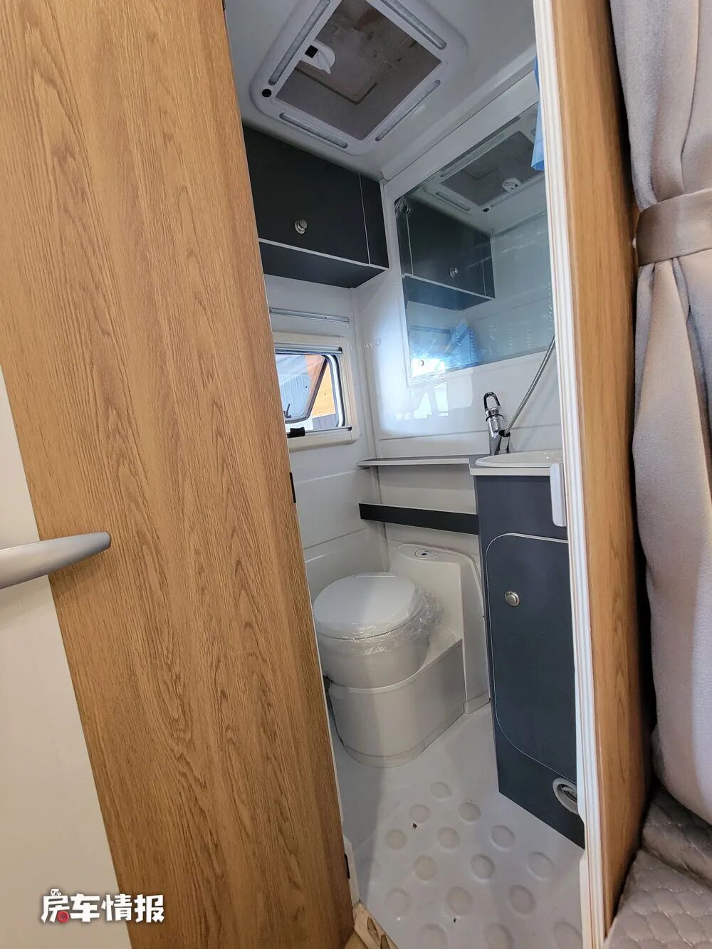 尾部的卫浴室内整体空间表现还不错,带有马桶、梳妆镜、洗手台、淋浴花洒以及储物柜等,满足出行的洗漱需求。