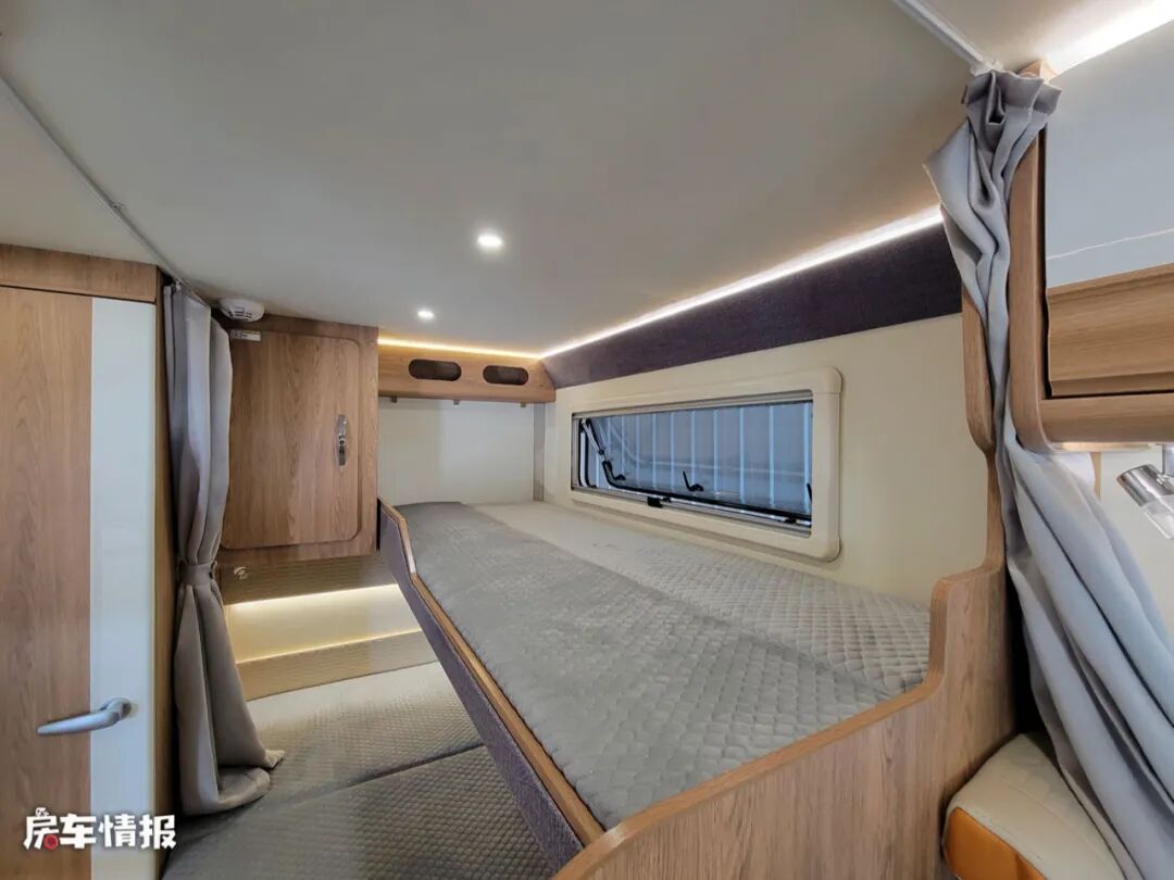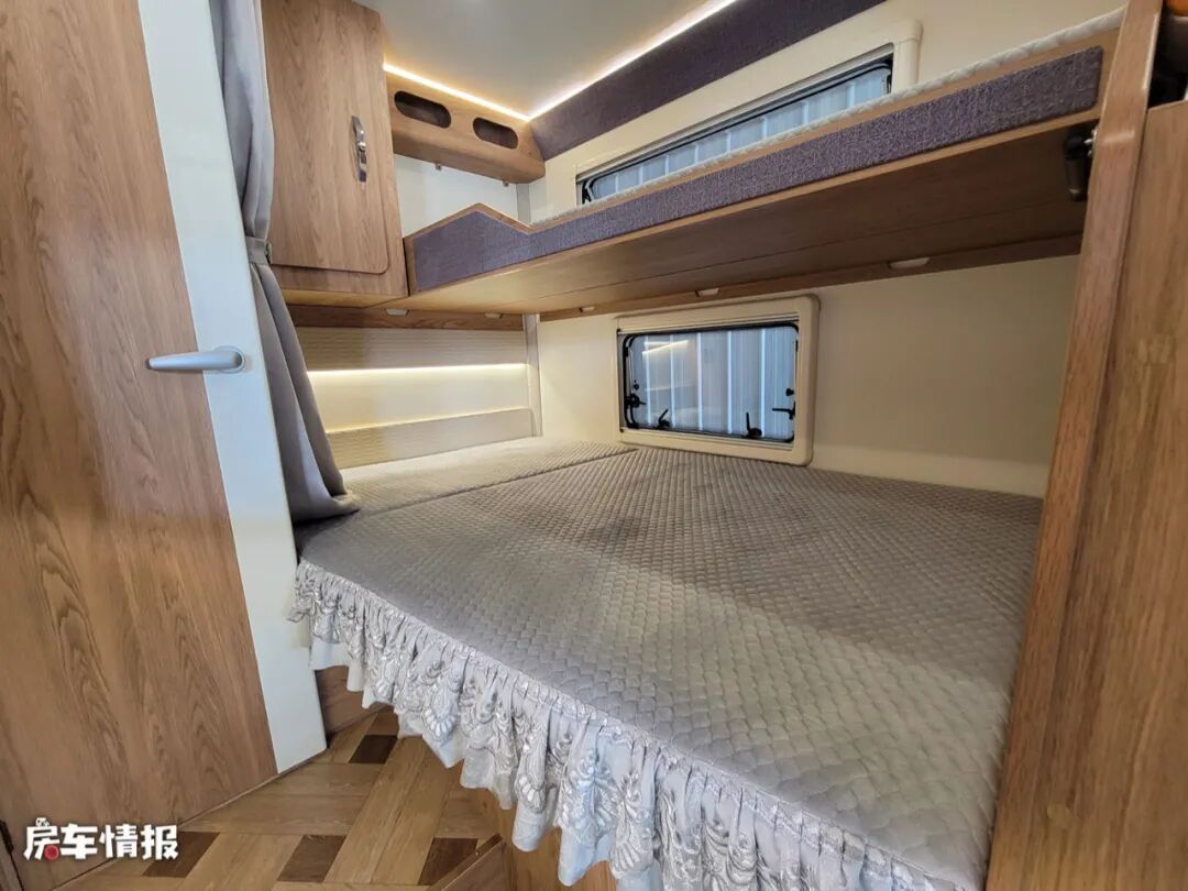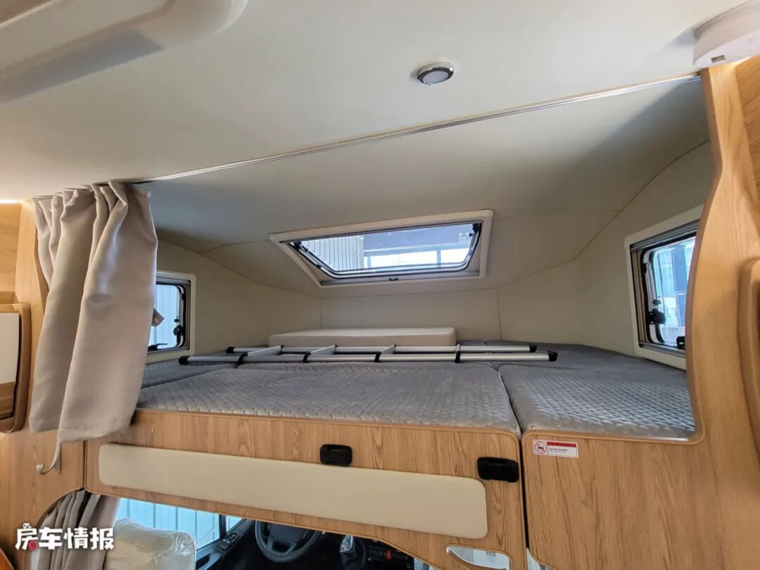 在前方驾驶室上方的大额头区域内带有一张双人额头床,尺寸为2200*1600mm,额头床三面环窗,可以带来良好的采光度,天气好的时候还可以用作通风换气使用。