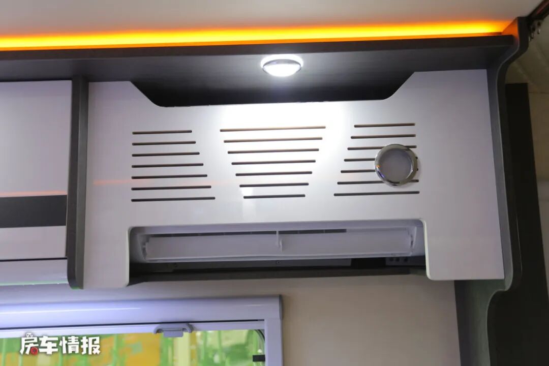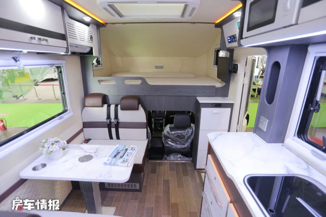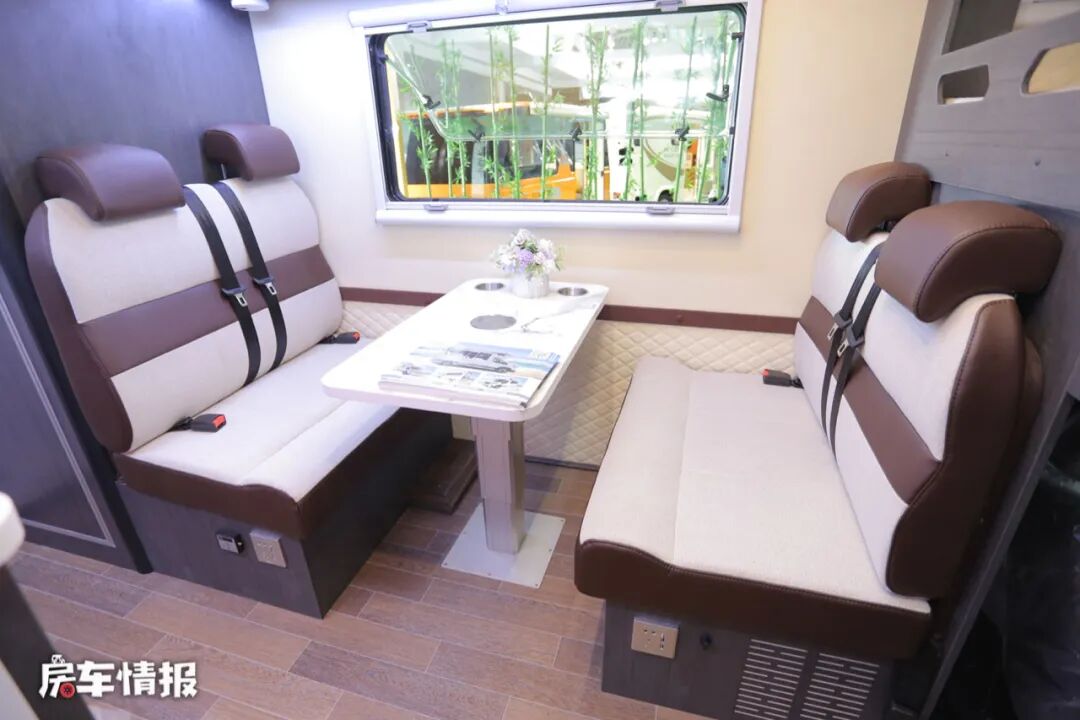 会客区采用了四人对卡座沙发+升降餐桌的设计,虽然是四人设计,但是沙发和升降餐桌晚上可以变成一张单人沙发床,所以整车更适合三个人使用,比如一家三口,另外在顶部还提供了储物吊柜,并配备了一台空调。