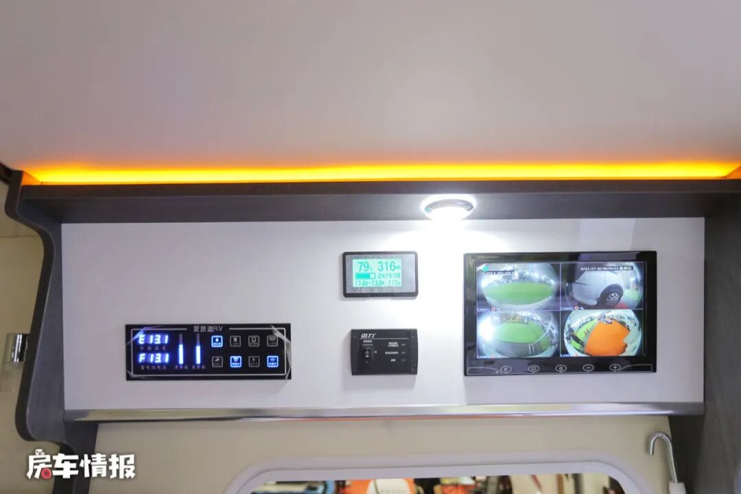 电路上,这款房车搭载了一台3000W的逆变器,提供12V 400Ah的锂电池,同时在顶部还配置了800W的太阳能电池板;水路上则提供了120L的净水箱和60L的灰水箱,一家三口使用还是没有问题的。