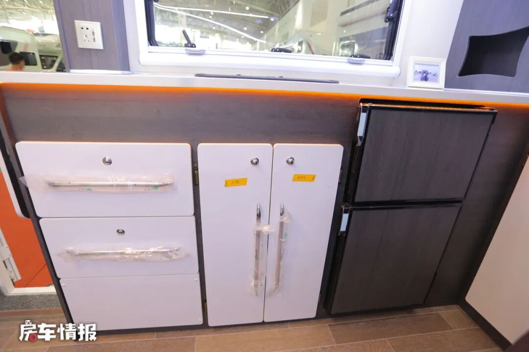 除此之外,厨房区上方还配置了一台微波炉,下方则嵌入了一台85L的双开门冰箱,也可以存放2-3天的食物。