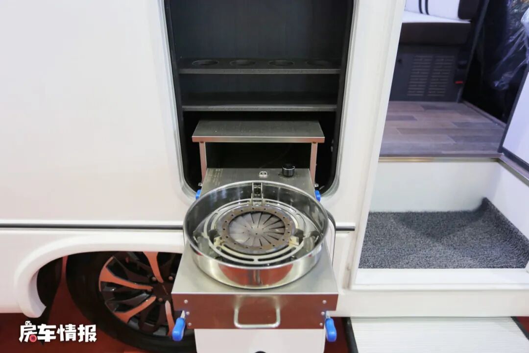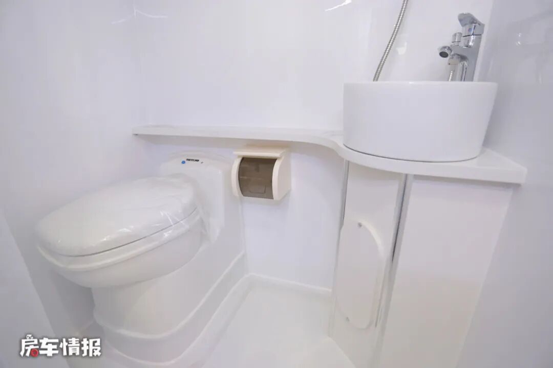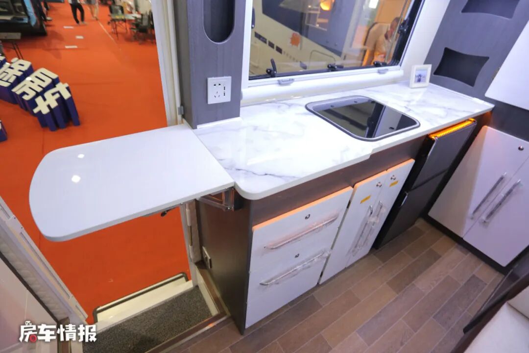 这款房车的厨房操作台面积还是不错的,侧面还带有可拓展的小桌板,因为车身外部配置了抽拉式燃气灶,所以这个台面上置提供了带盖的不锈钢水槽,但是因为提供了电源接口,后期也可以加装便携式电磁炉或者卡式炉,天气不好的时候,在车内也可以进行烹饪活动。