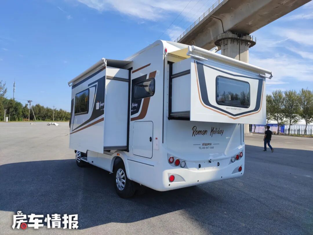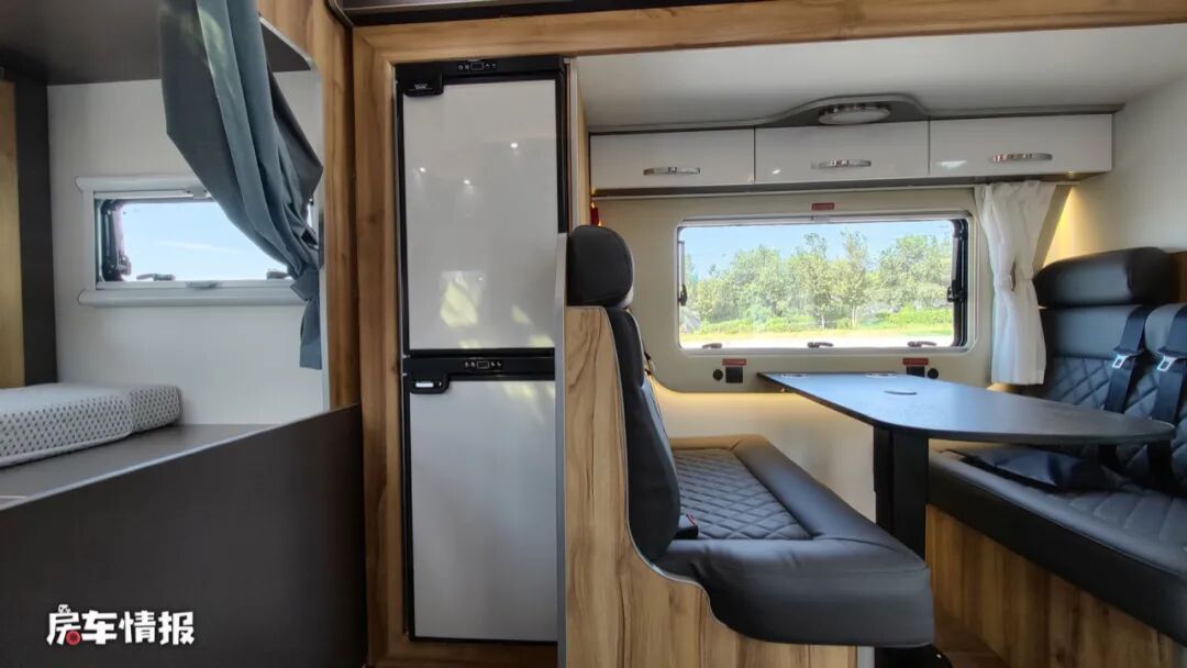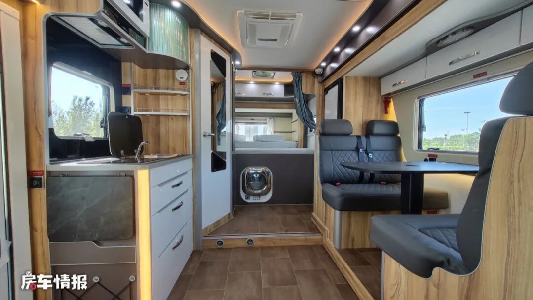 尺寸方面,整辆车的长宽高分别为5990*2334*3050mm,临界6米的车身长度可以满足上蓝牌的规定,另外这款房车是一辆双拓展型房车,车身左侧和后侧都带有拓展机构,足以保障内部空间的使用。