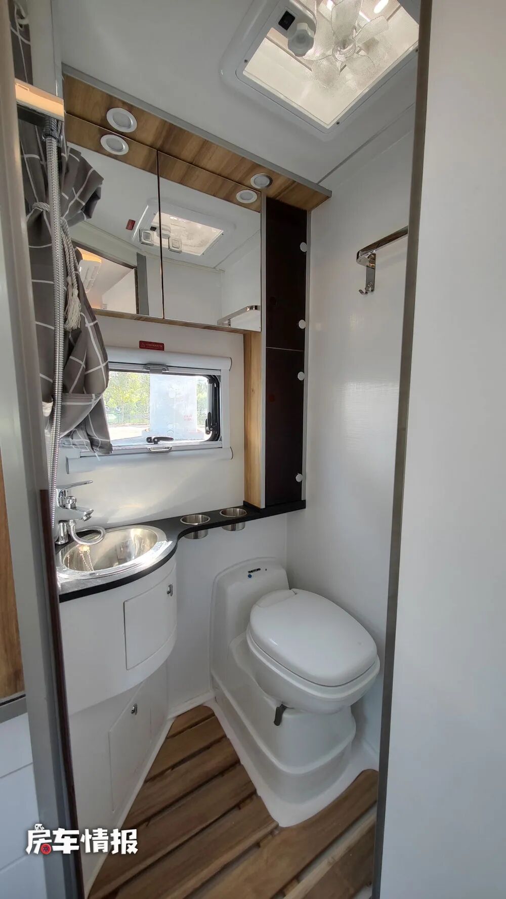 厨房区后方是全车的卫浴室,内部设备很齐全,带有可旋转的盒式马桶、洗手台、淋浴花洒、镜面的储物柜以及换气扇等,出行的洗漱需求完全可以满足。
