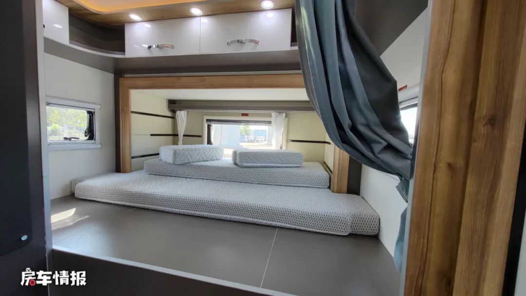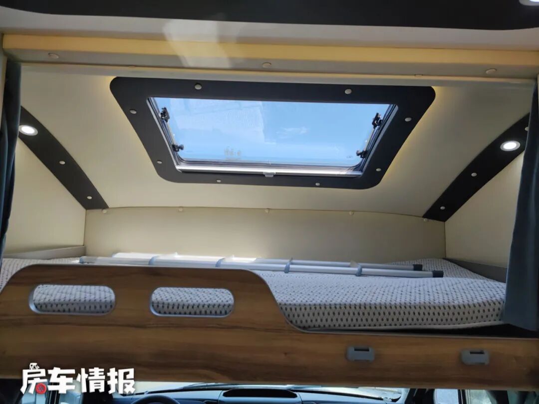 在驾驶室上方的额头区域内提供了一张双人额头床,带有一扇大尺寸的外推天窗,可以为整个区域带来良好的采光度,同时也能够通风换气。