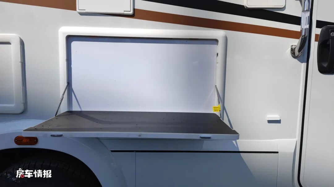 车身外侧同时提供了较为丰富的生活设施,包括右侧上方的遮阳板,下方的外置翻板、外置淋浴器以及外置的抽拉式灶炉,另外在尾部还带有左右贯通式的大尺寸储物舱,可以满足平时存储行李的需求。