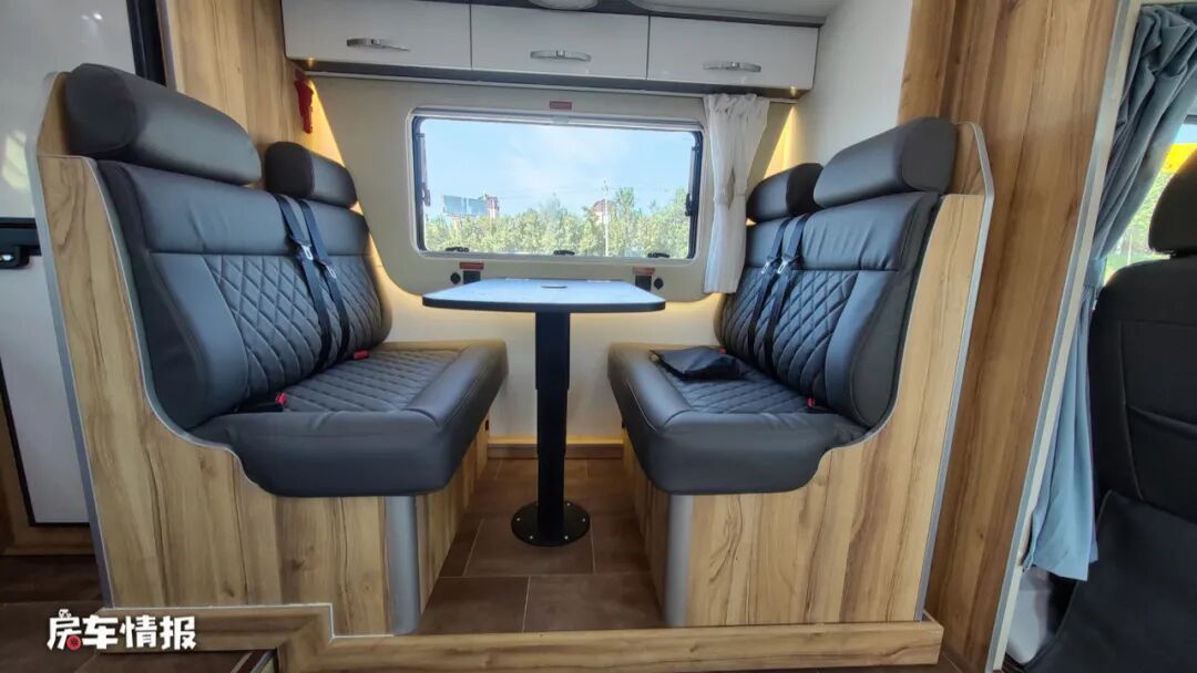 位于左侧拓展区域内的是全车的会客区,采用了经典的四人对卡座+升降餐桌的设计,皮质软包的座椅可以带来舒适的乘坐感受,同时在顶部上方还提供了三个储物柜,可以存放一些零食饮料,也方便后期拿取。
