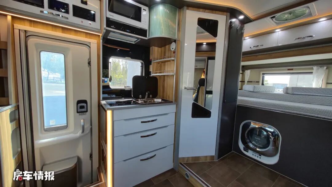 乘客门后方为全车的厨房区,厨房操作台的尺寸并不是很大,但是在侧面提供了可拓展的小桌板,也方便平时备菜使用,台面上带有电磁炉和不锈钢洗菜盆,为了缓解油烟的影响在上方还吊装了一台抽油烟机,顶部则提供了一台微烤一体机,而旁边则是圆弧形酒柜的设计,凸显了设计的精致感。