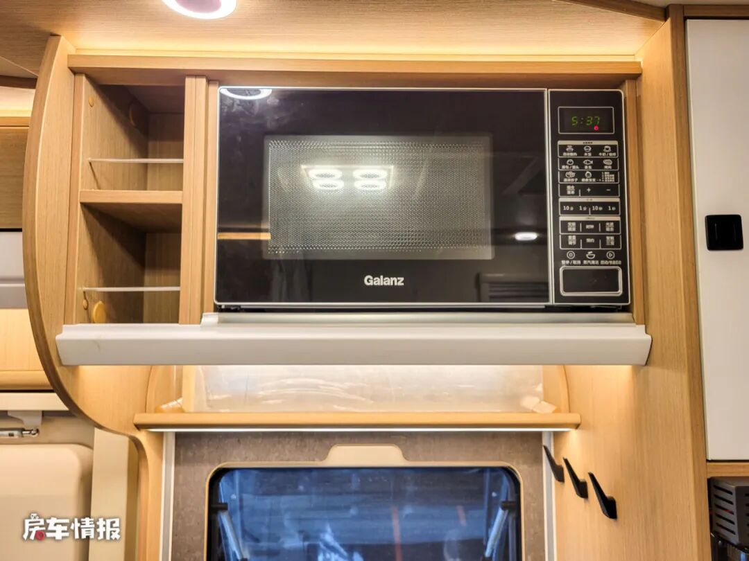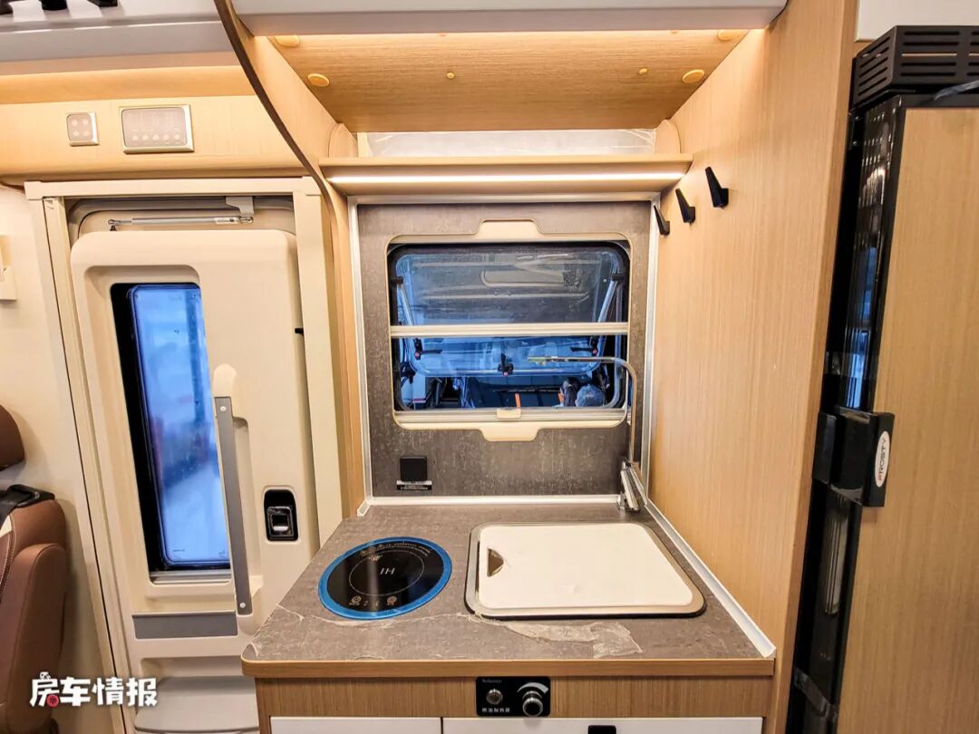 乘客门后方为全车的厨房操作台,台面上带有电磁炉和配案板的不锈钢洗菜池,同时上方还嵌入了一台微波炉,下方则提供了储物空间,可以满足基础的烹饪需求。
