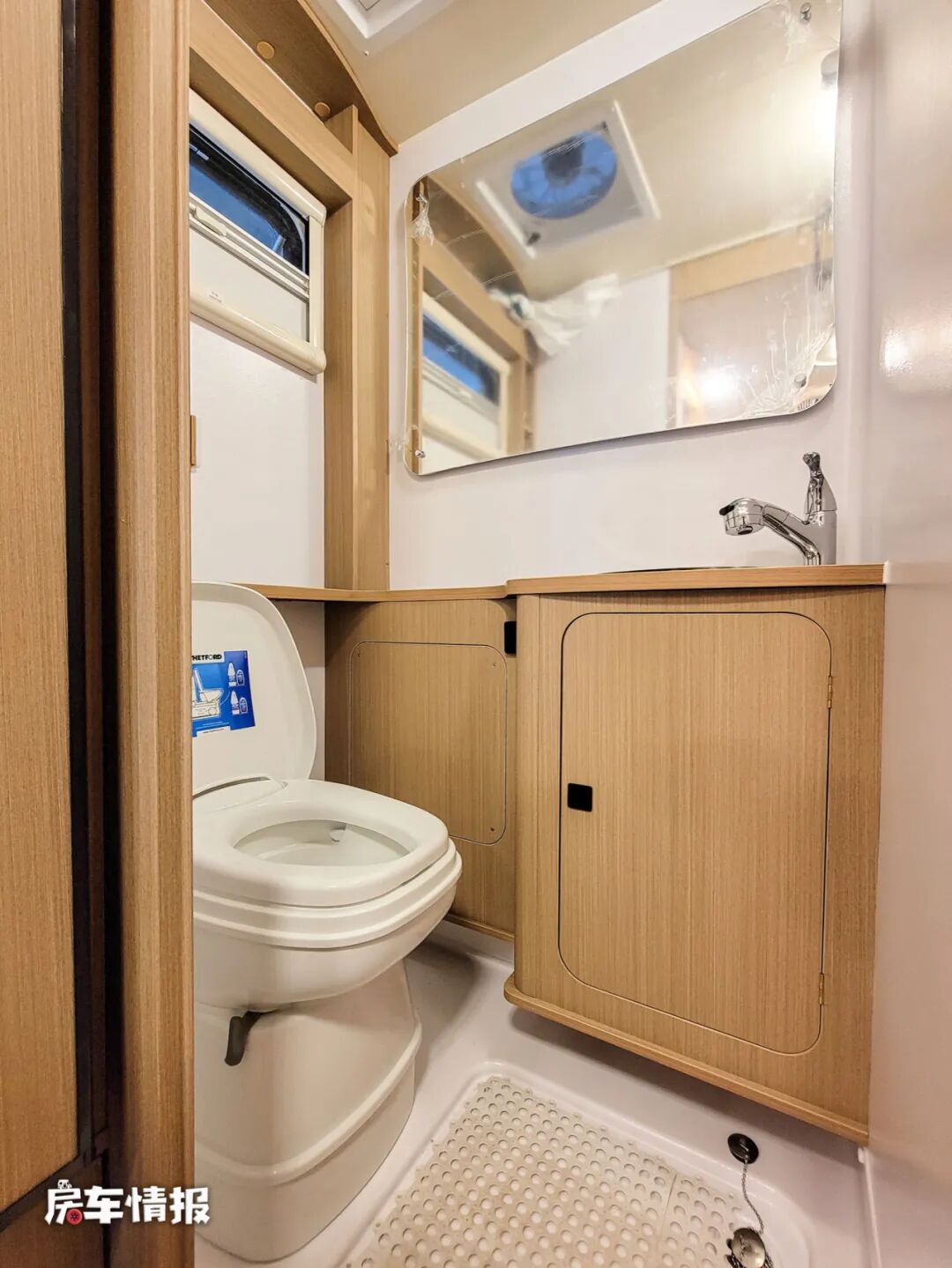 全车的卫浴室这次在外观上做了一个小小的改动,平面式设计的柜门更能节约整车的空间,进入内部可以看到整体的面积还挺不错,带有马桶、储物柜和带有抽拉式水龙头的洗手台,以及侧面墙壁上大尺寸的梳妆镜,完全可以满足出行的洗漱需求。