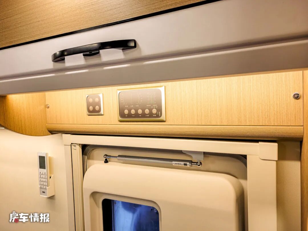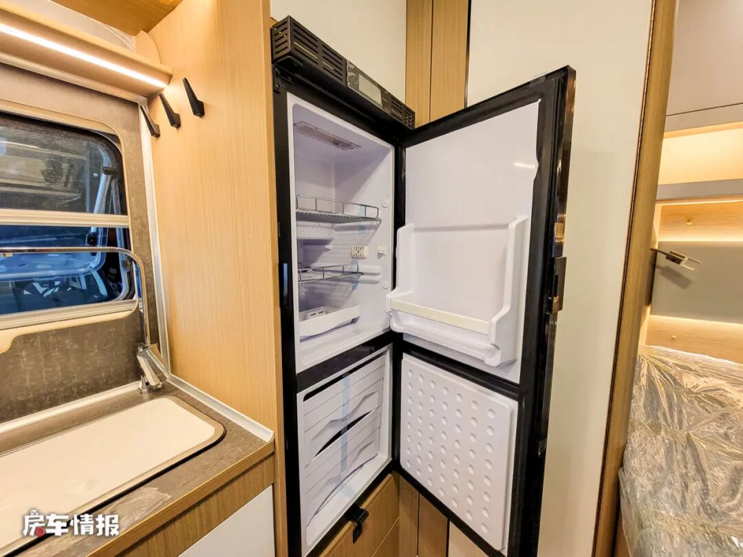 后方则是一台96L的房车专用冰箱,内部含有单独的冷冻区间,也能存放旅行中所使用的食材。