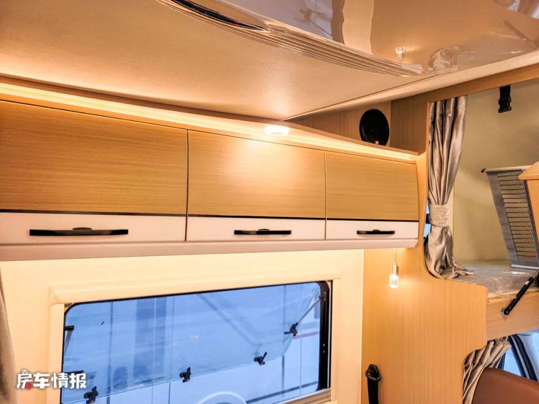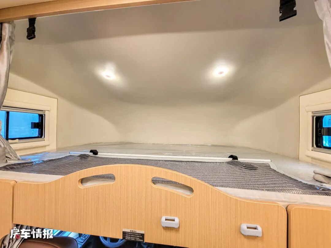 除去尾床之外,在前方的驾驶室上方的额头区域内还提供了一张额头双人床,尺寸约为2200*1400mm,也能够为两个人提供睡眠休息的地方,同时两边还带有外推窗,既能保证采光度也可以通风换气。
