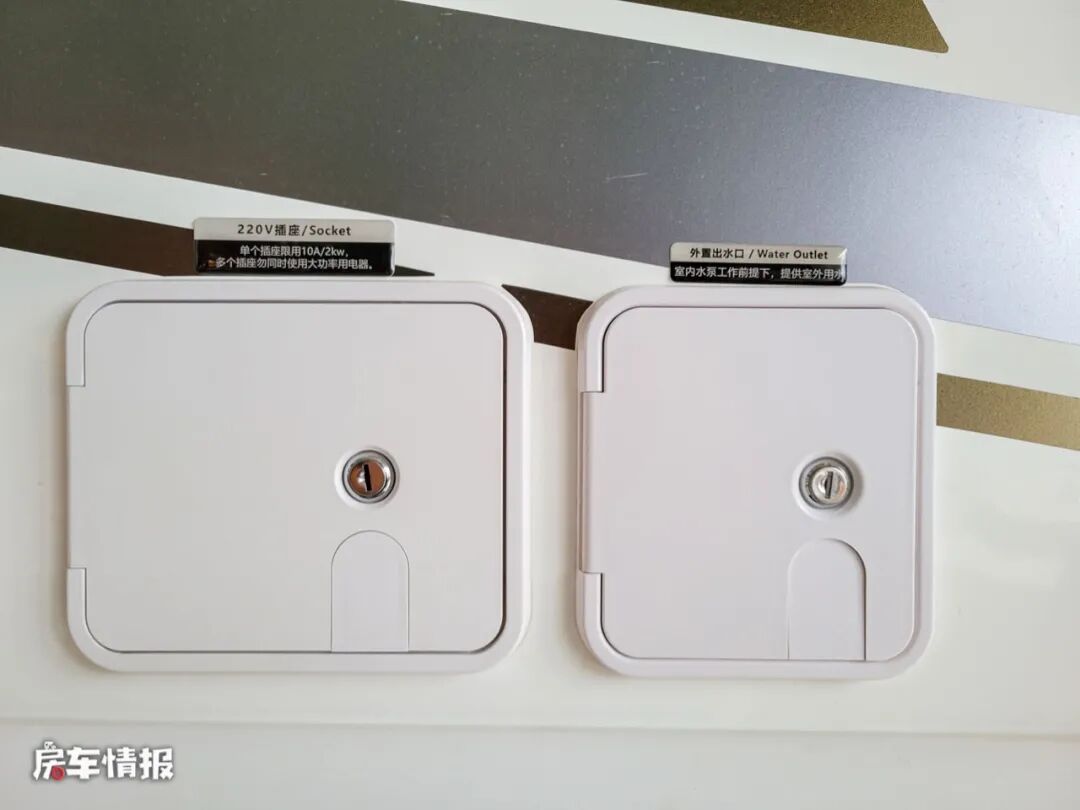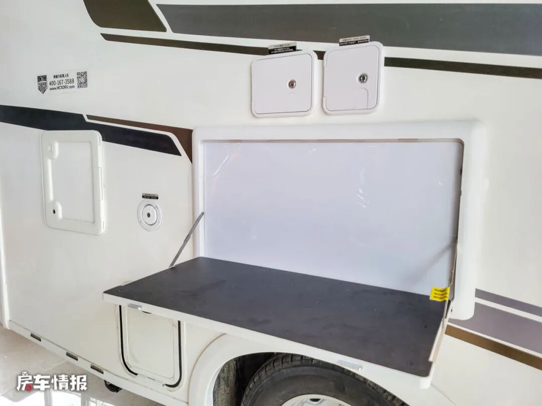 车身外部配置了比较基础的生活设施,包括右侧上方的手动遮阳棚、下方的外置翻板和抽拉式厨房,以及还提供了可接水管的出水口,这样就可以满足在车身外部进行烹饪的需求了。