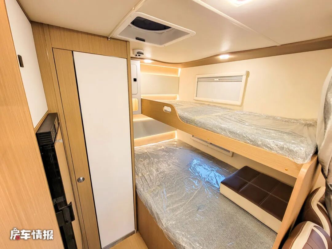 整车的休息区也用了全新的设计,采用了当下最为流行实用的上下子母床,上层单人床尺寸为1950*800mm,下层双人床尺寸约为1950*1300mm,上下床一共可以容纳三名成年人使用,当然更适合亲密度比较高的一家三口,不需要上床的时候也可以折叠起来,为下床留出更多的空间。