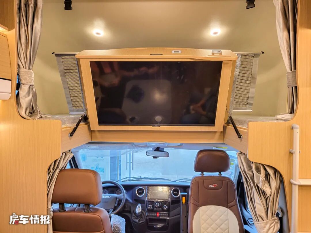 翻起床板就可以看到隐藏在下方的一台32寸液晶电视,平时一家人坐在会客区看看电视享受一下轻松的时光。