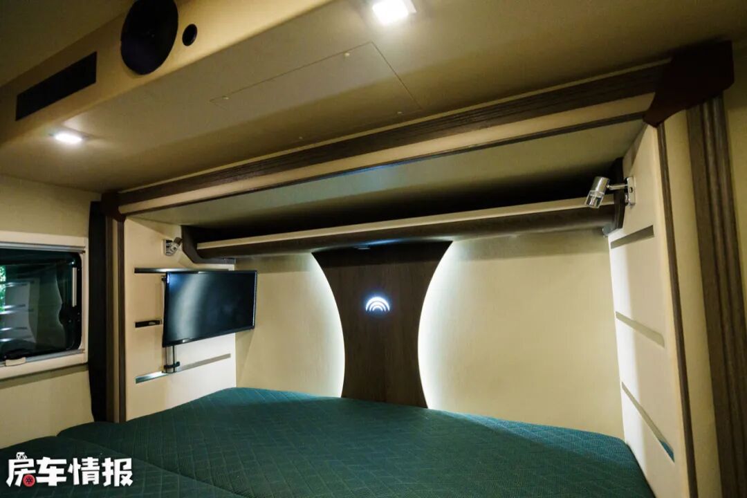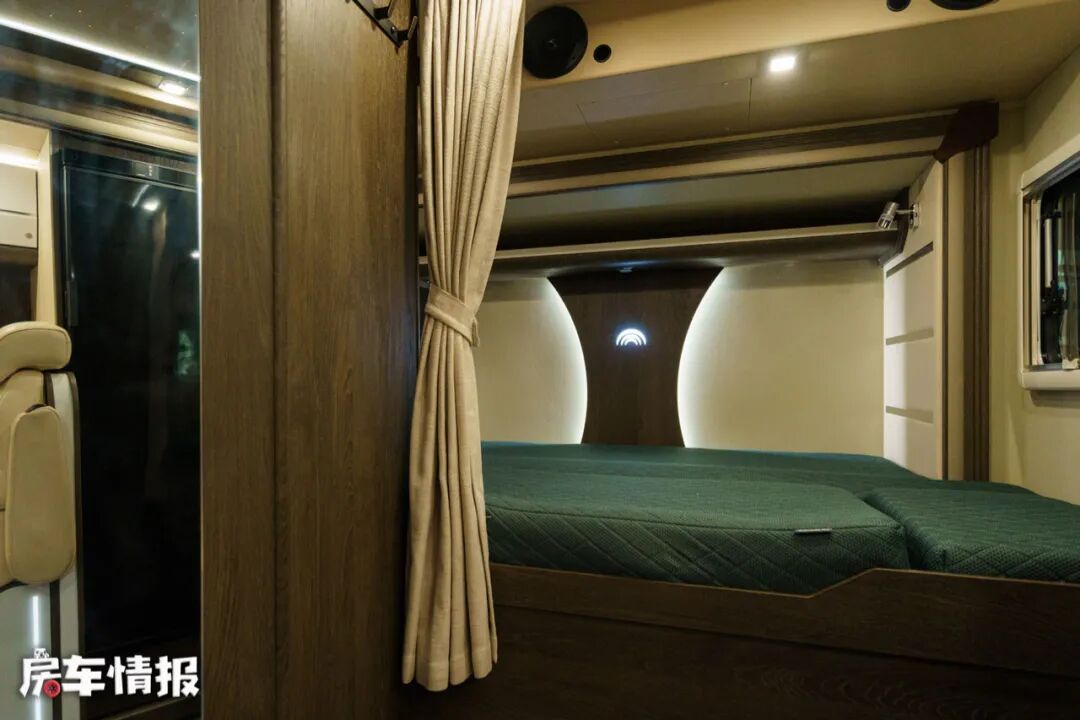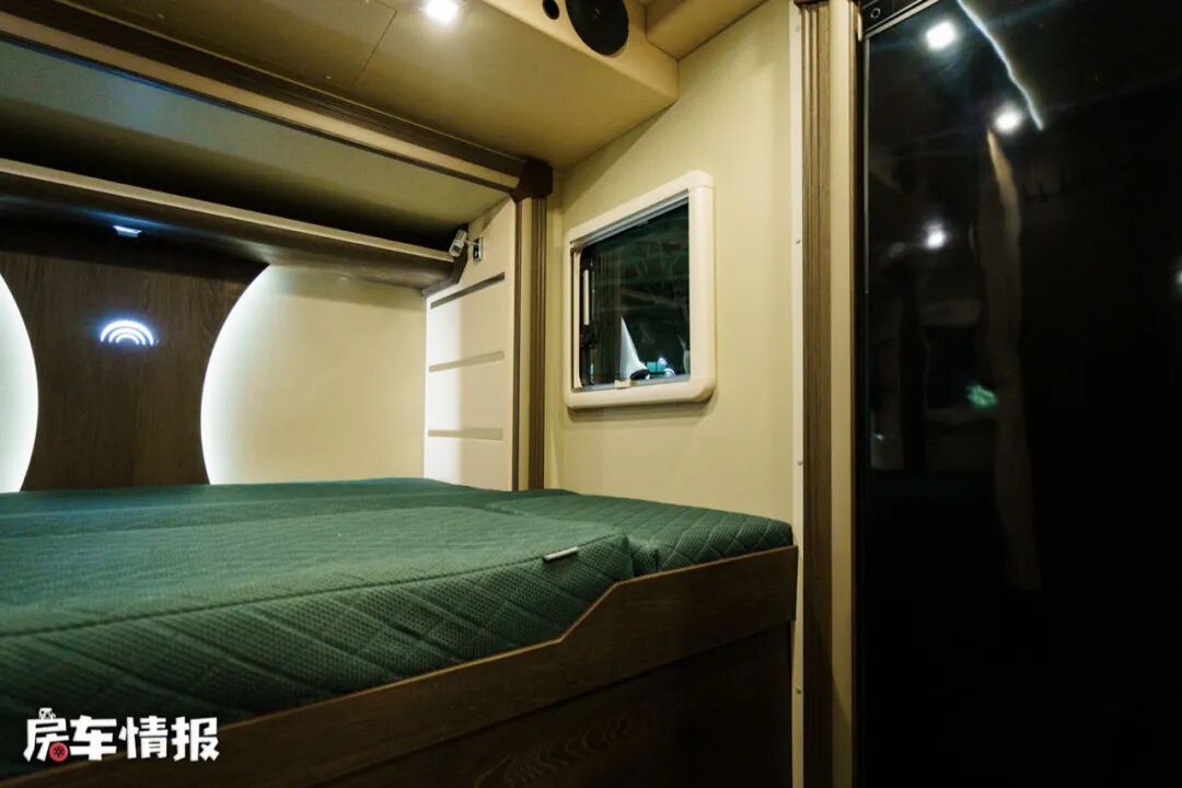 除了大尺寸的双人尾床之外,在前方驾驶室上方的额头区域内还提供了一张双人床,尺寸为2100*1500mm,也是尺寸相当大的一张床铺,足够满足两个成年人使用。而且额头区两边的窗户加入了电控隐私玻璃膜,这个设计还是非常特别的呢~