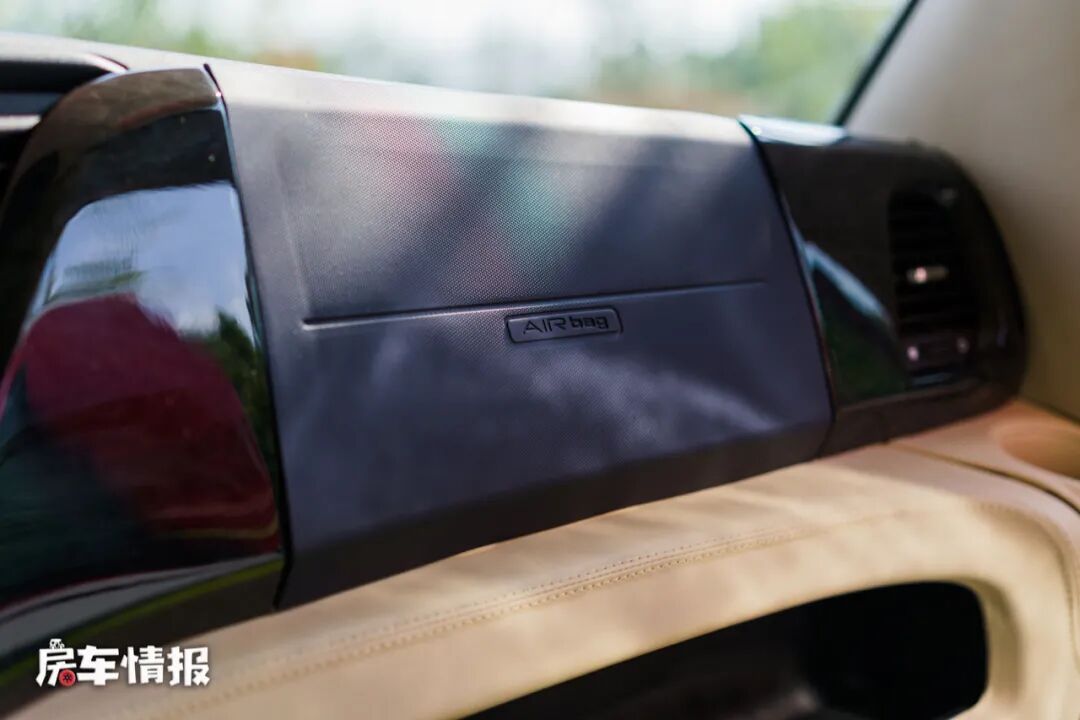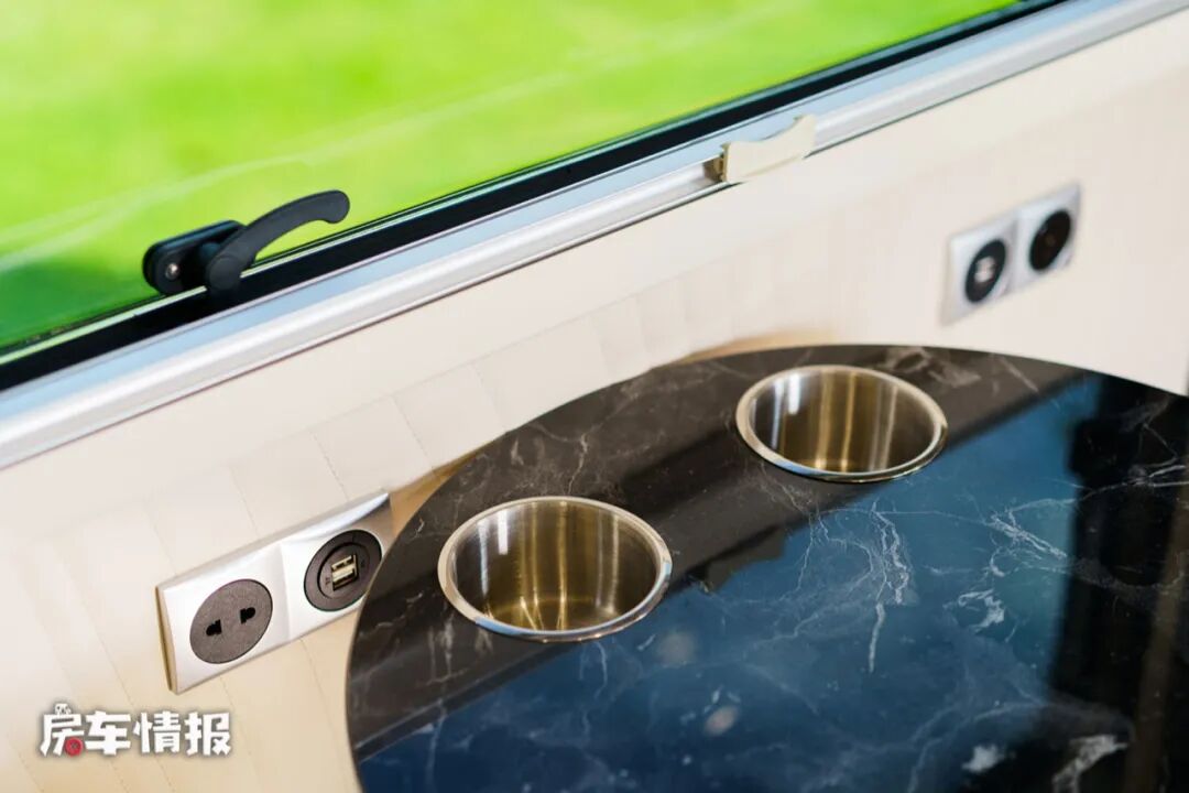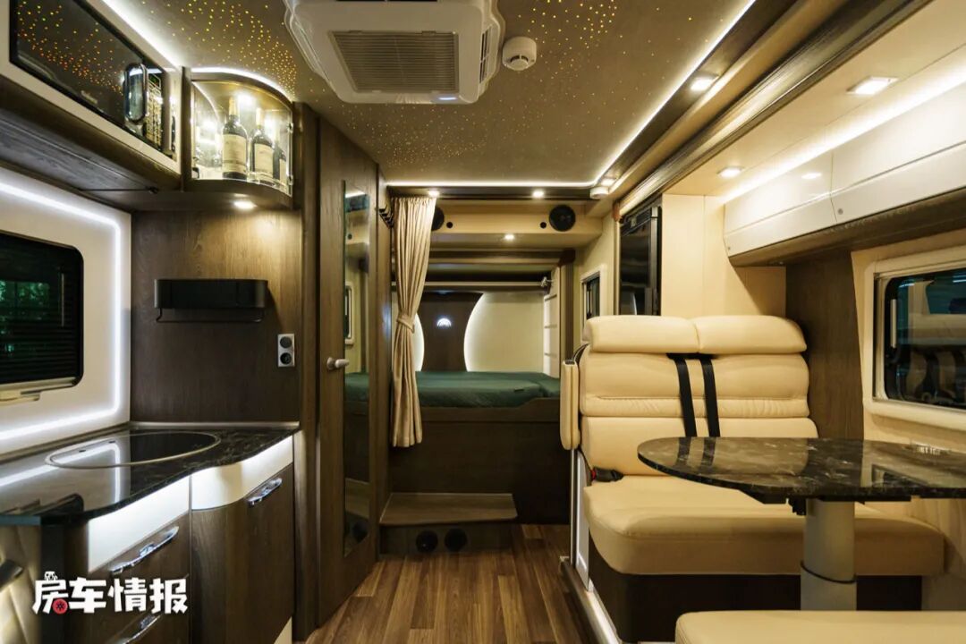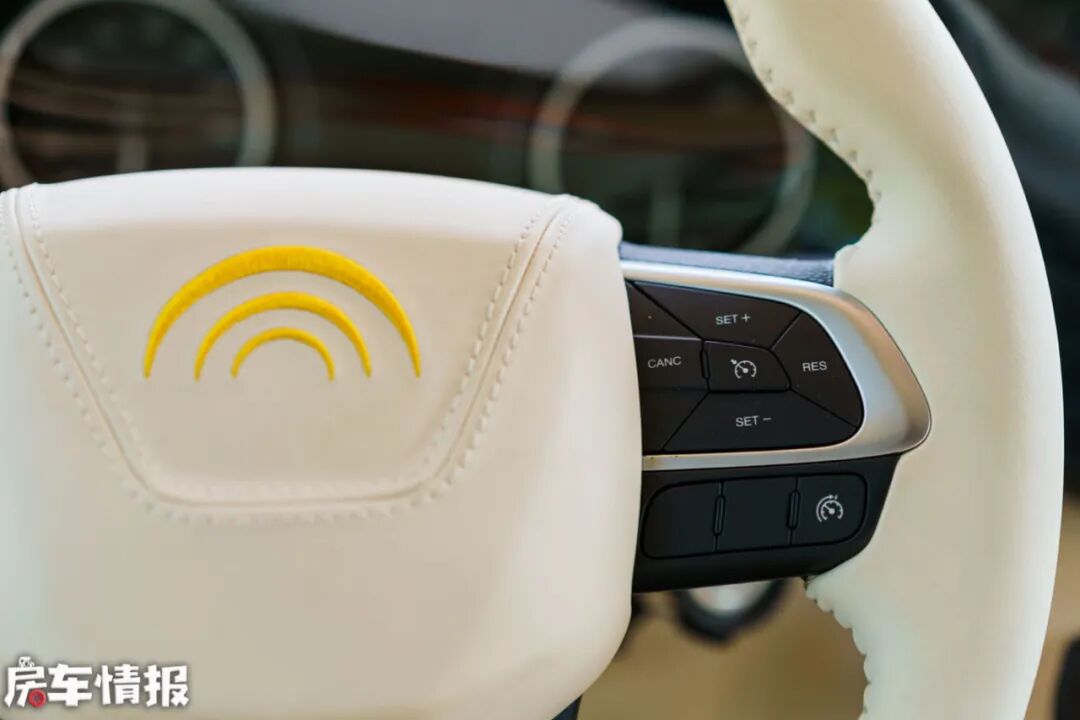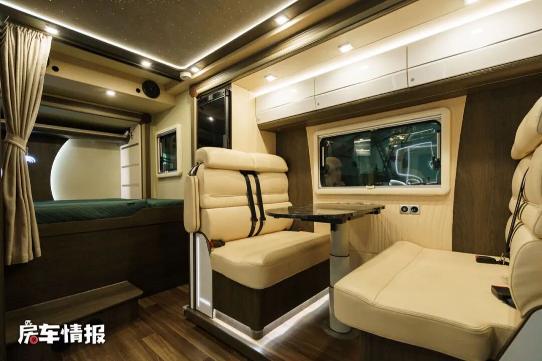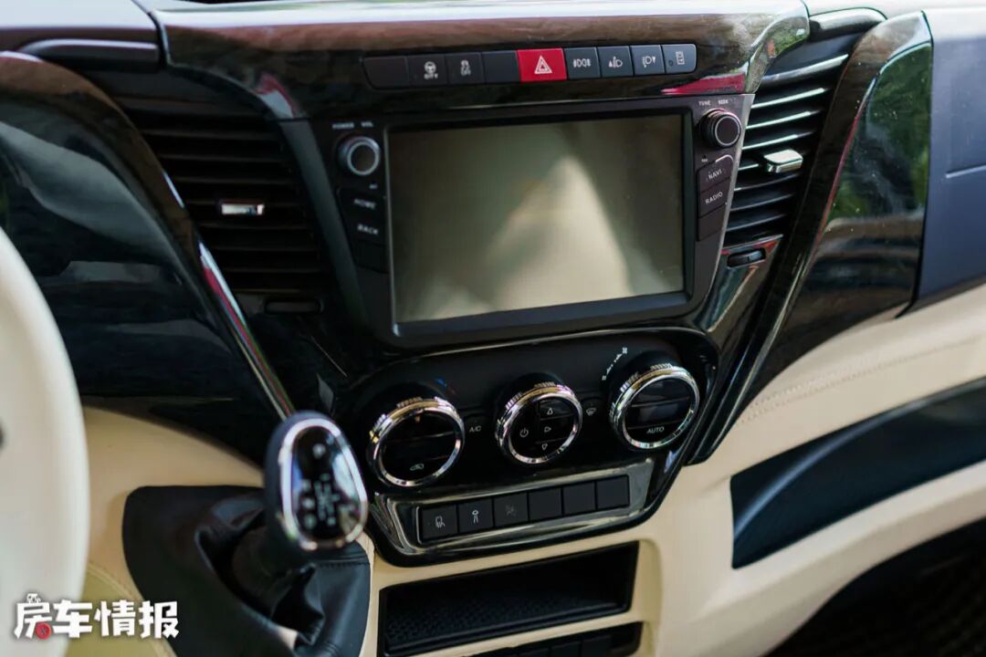 因为采用了三类底盘,所以整个驾驶室也与我们常见的不同,使用了呼应后车厢生活区的配色,使得车内整体更加的协调和统一,皮质软包的工艺也突显了精致感,同时全车还对A柱进行了加强处理,可以加强整车的刚性。