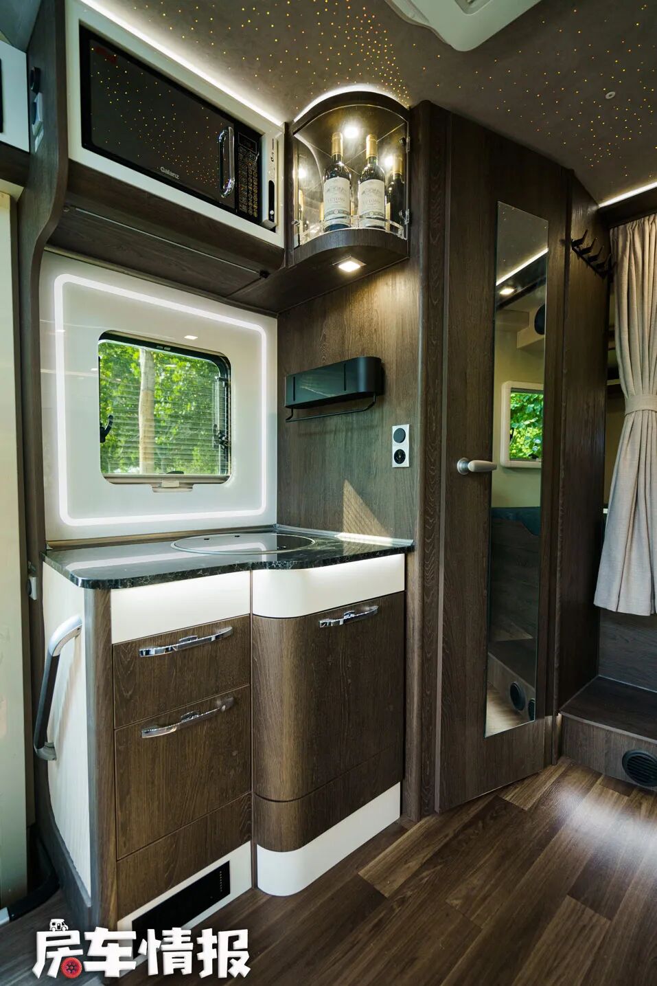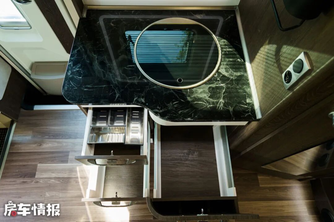 这款房车的厨房区也是一大亮点,不仅采用了仿大理石的面板,同时是使用了一体式无缝封边的工艺,更显整洁,台面上带有大尺寸的翻盖不锈钢洗菜盆,同时使用的是折叠式的水龙头,平时也不占用整体的空间,另外在顶部还带有一台微波炉,上下方都提供了大量的储物空间,足够存放烹饪用具。
