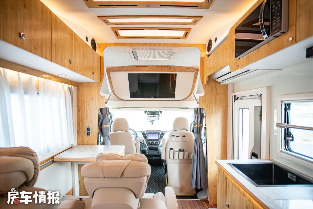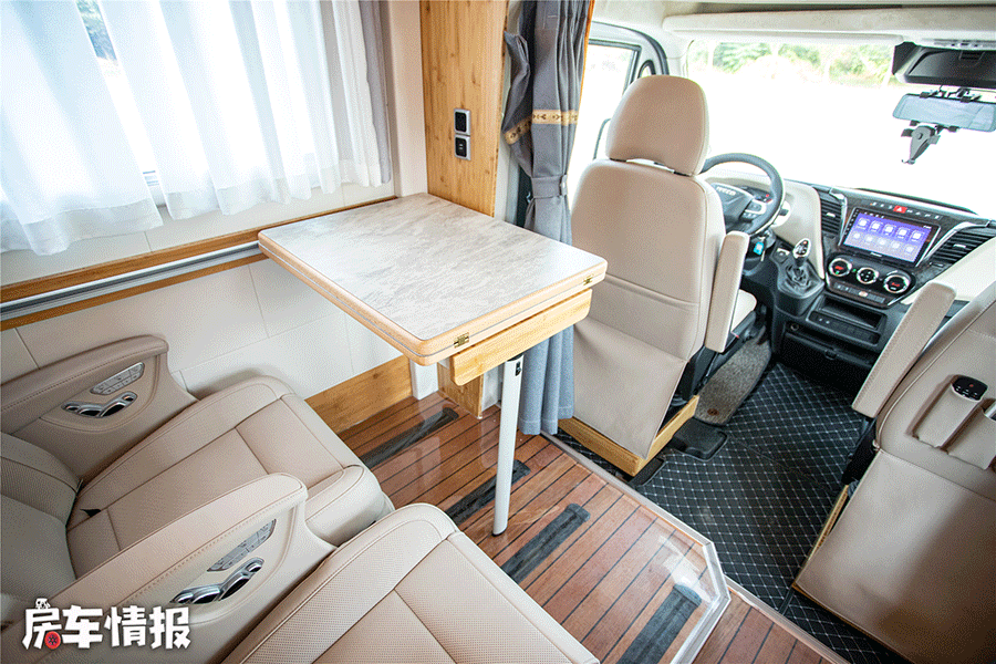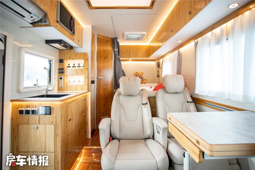 进入车厢内部,首先看到了是大面积原木色家具板材,实际上这款车的家具外板全部使用了竹子制作,不仅营造出了比较清新素雅的视觉效果,同时也更环保,让车内空气更洁净。