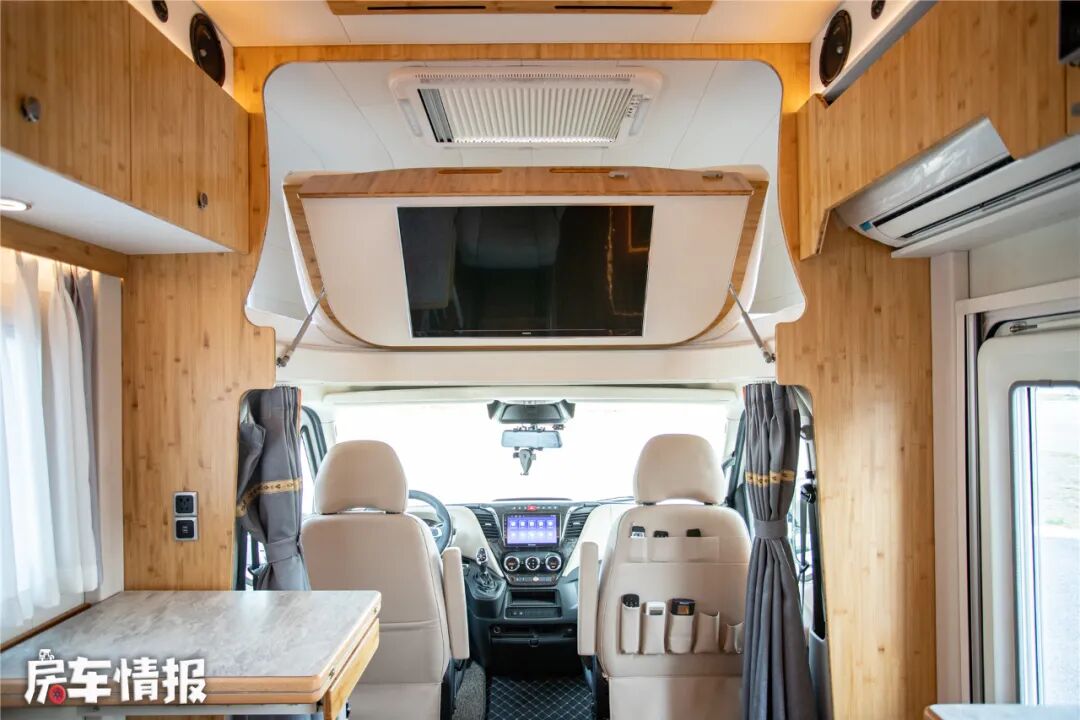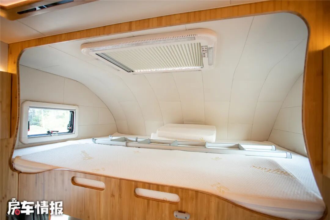 驾驶室顶部提供了一张双人床,尺寸约为2200*1500mm的双人床,由于车顶比较平直,额头床内外侧的空间也挺不错,再加上内墙上采用的皮质软包,营造出了不错的豪华感,日常使用也比较舒服,掀起床板,下方则是一台飞利浦液晶电视。