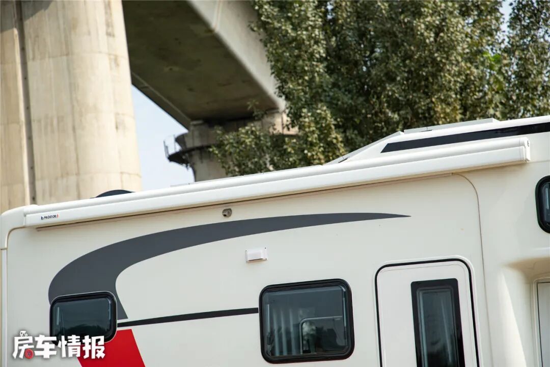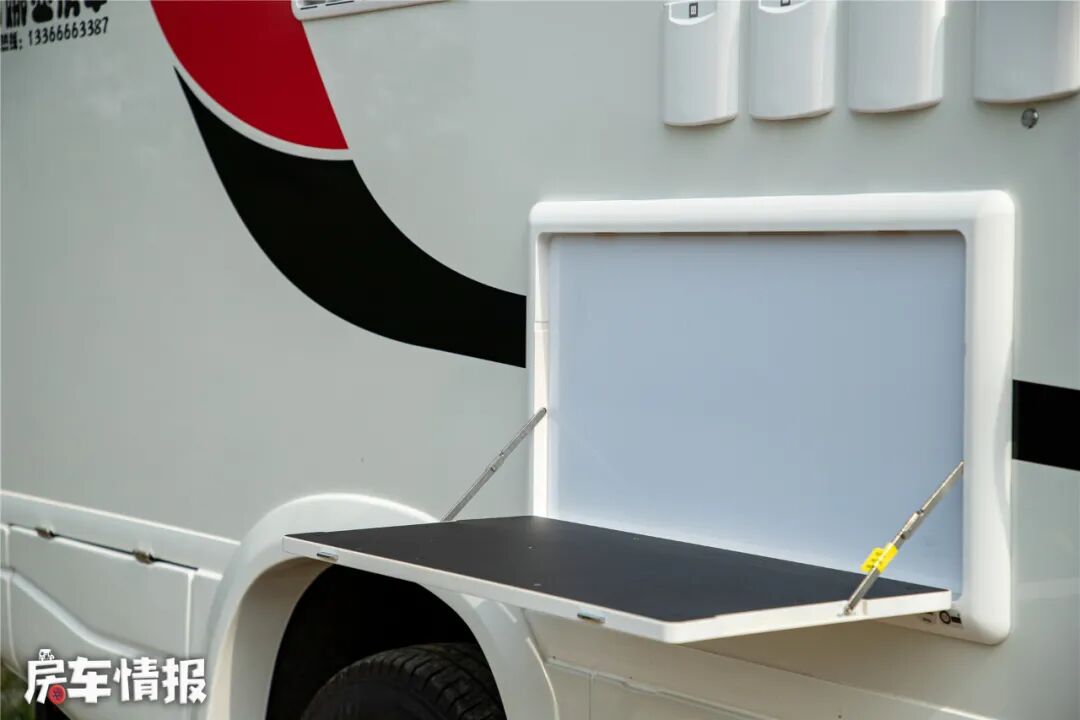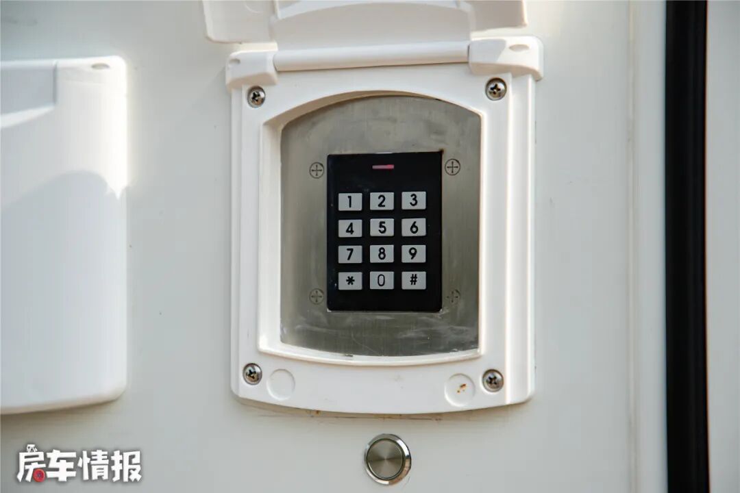 车身外部提供了丰富的外部设备,顶部提供了一部电动遮阳棚,控制方式也比较有意思,并不是常见的按钮开关,而是通过遥控器打开,操作更便捷;车厢中门还采用了密码锁的开关,即便没带钥匙,也可以通过密码打开,比较有科技感。