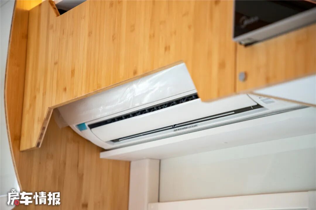 车内的厨房区域位于中门后方,设备比较齐全,提供了微波炉、抽油烟机、电磁炉、洗菜池等基础设备,而位于内侧的墙壁上同样提供了多组取电口。中门上方还提供了一台三菱1.5P家用变频空调,带有温感功能,可以自动向车内人员较多的位置送风。