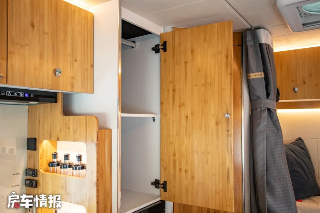 厨房后方则是一个空间还不错的储物柜和房车专用冰箱,日常拿取物品比较方便。