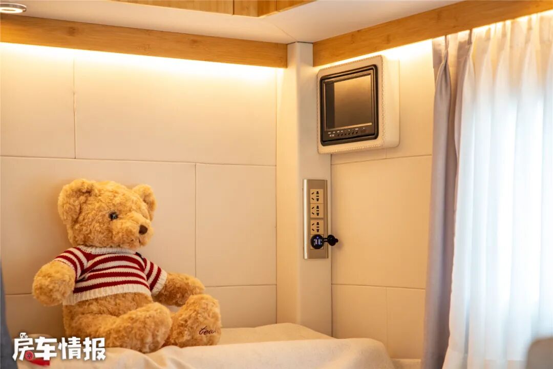 车内的另一个休息区位于车厢尾部,采用纵置双人床的设计,尺寸约为1900*1200mm,可以满足两名成年人休息,位于床位的内侧还设有车上的一个四路监控,当车外有情况发生时,躺在床上就能查看,不用再走到车厢中门去看,挺方便的。