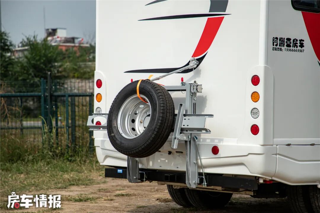 车身尾部的整体设计比较简洁,提供了流媒体后视镜、360°倒车影像、倒车雷达等,底部还提供了三孔位的拖车方口,便于后期牵引房车、摩托车等设备,实拍车型选装了一部电动摩托车拖架。