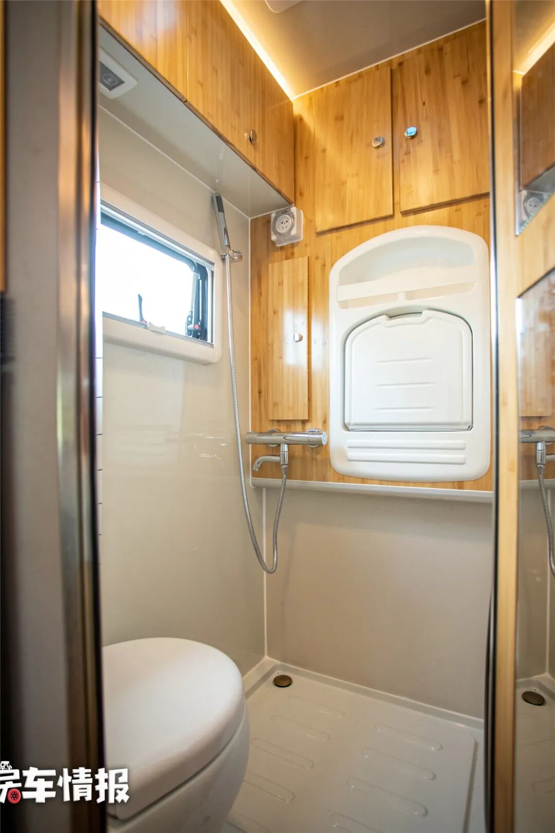 卫生间位于车厢尾部,内部空间挺大的,成年人在里边可以自由活动,设施方面提供了换气扇、梳妆镜、马桶、隐藏式洗手池、洗衣机等,卫生间内部家具板材同样采用竹子。