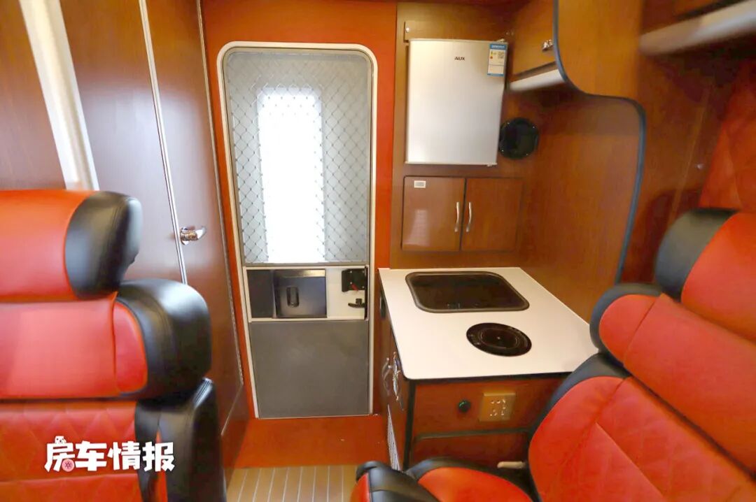 这款车采用了后开门的进入方式,进门左侧为一个小型的厨房区,台面的面积并不是很大,提供了一个电磁炉和一个翻盖的不锈钢水槽,水龙头采用的抽拉式设计方式,侧面的壁板里镶嵌了一台50L的车载冰箱,下方是一台热水器,台面的下方放置了一些电瓶等电器设施,上方提供了一个储物吊柜。