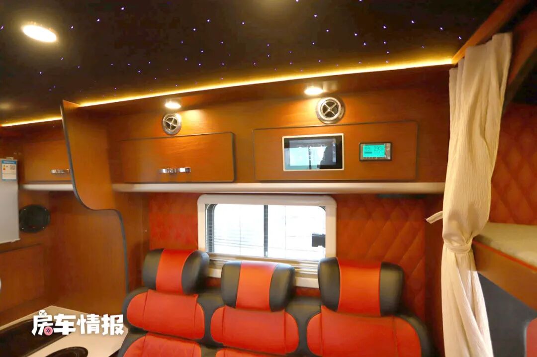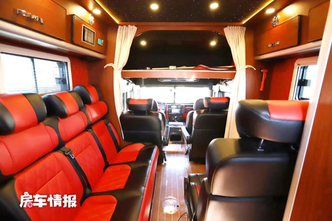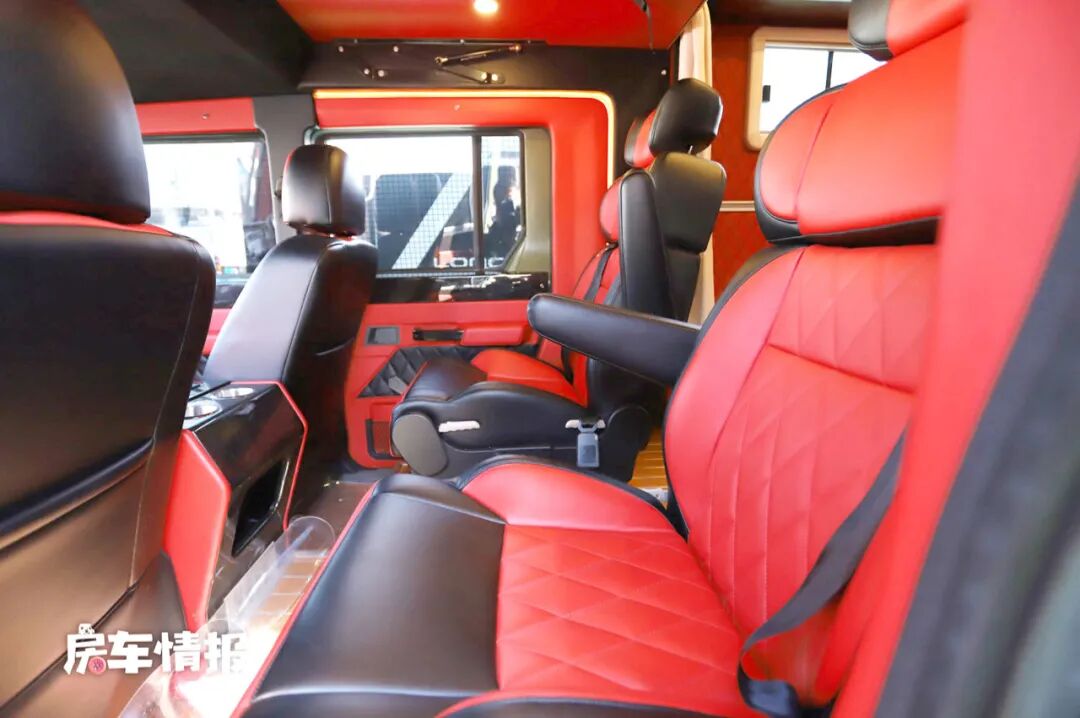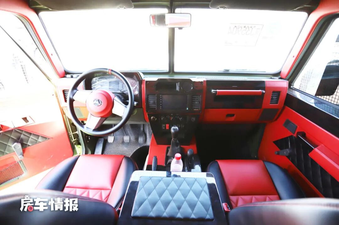 驾驶内部采用了红黑撞色的配色,和车外的军绿色也反差极大,这款房车采用了双排驾驶室设计,主副驾驶座椅都采用了全皮软包的工艺,两个座椅之间还提供了一个大尺寸的中央扶手,另外中控台上匹配了一台彩色触摸显示大屏,方便平时操控。