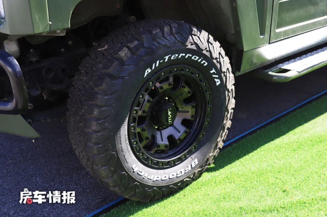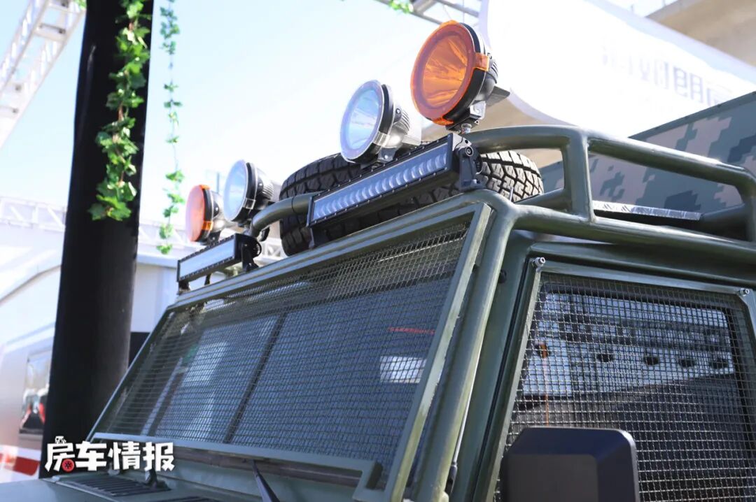 整车都采用了军绿色的配色,车厢部分为数码迷彩,非常的霸气。前脸独特的前格栅设计和包围护杠,使其更加具有越野气派,车顶部装配了四个户外射灯,不仅增加了夜晚的照射范围,更增强了自身的辨识度。