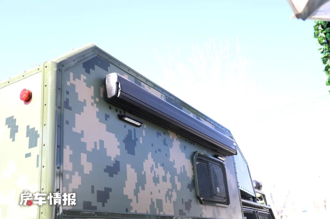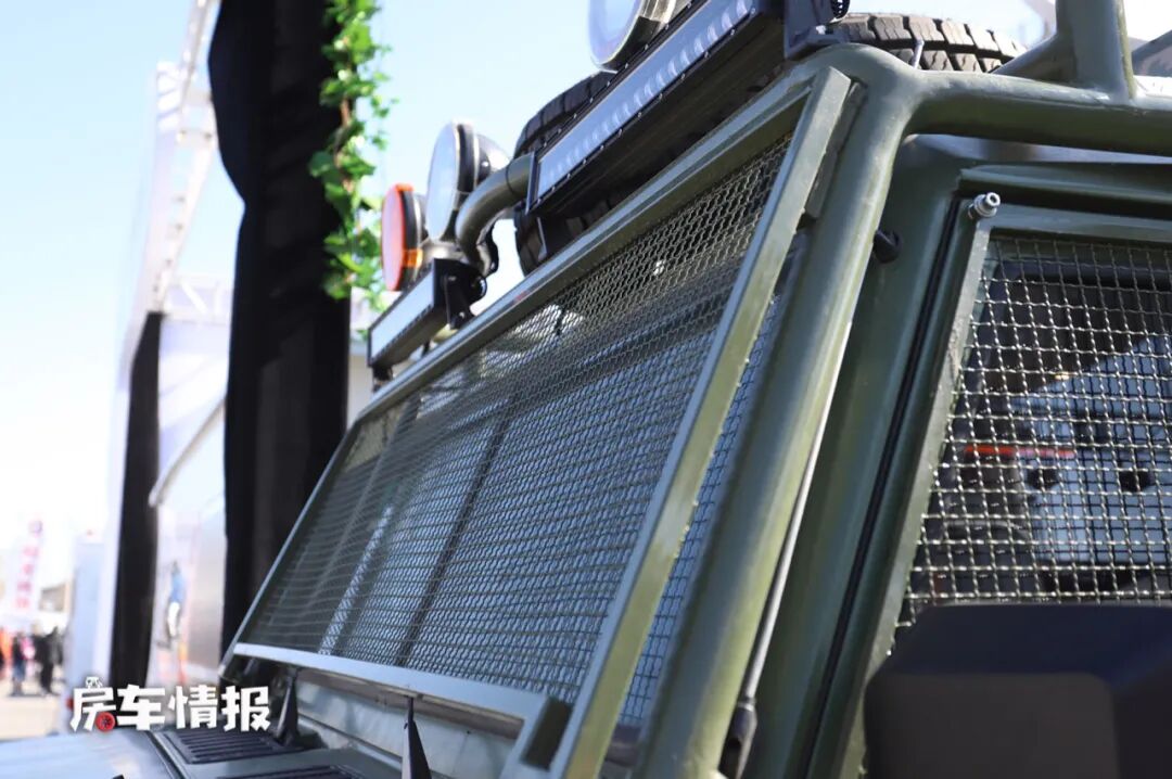 这款房车的车窗均配备了防护网,轮胎也采用的是越野AT轮胎,车身右侧的上方同样提供了一个2米的手动遮阳棚,方便平时驻车时在车外休息小憩。