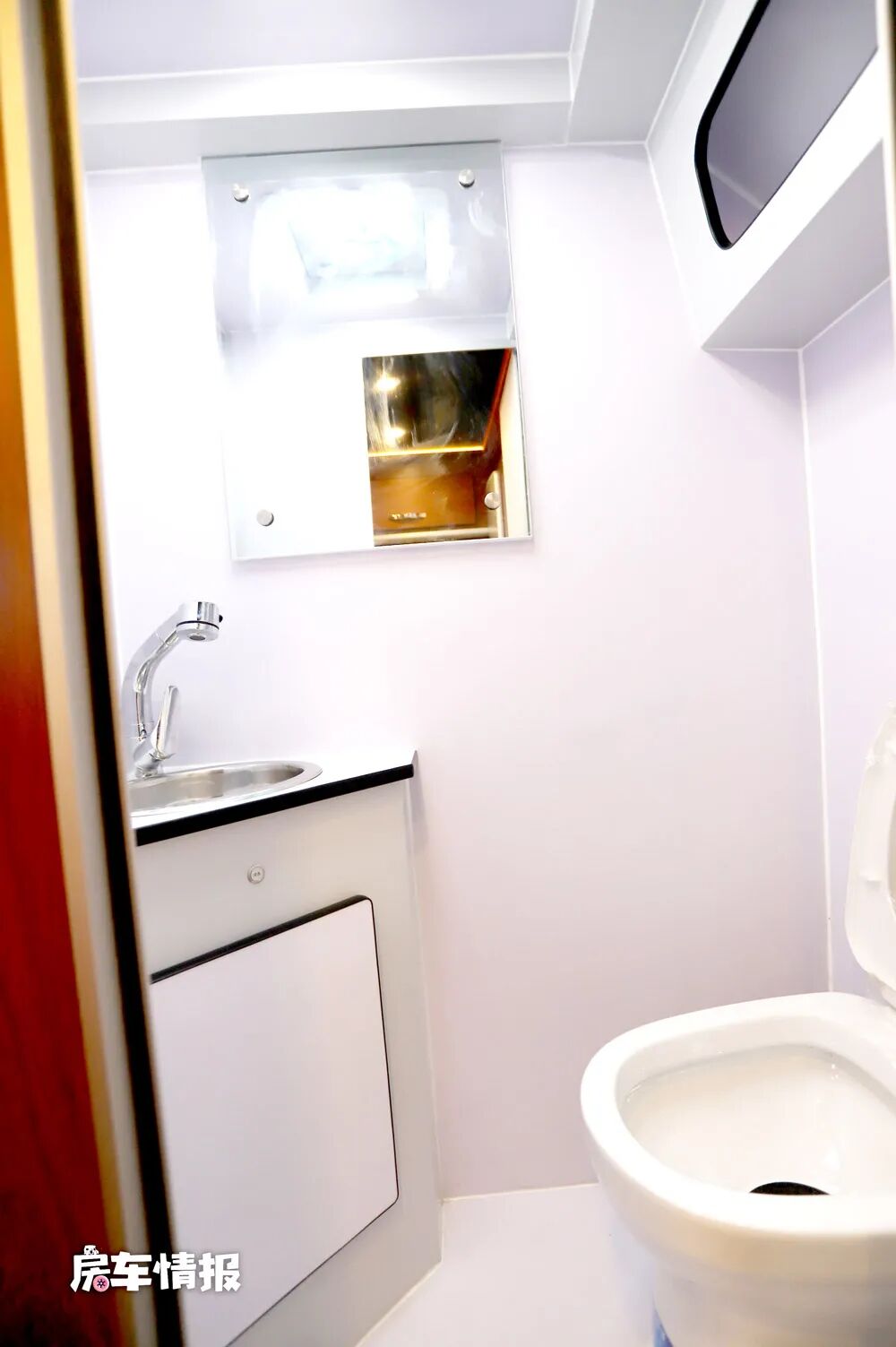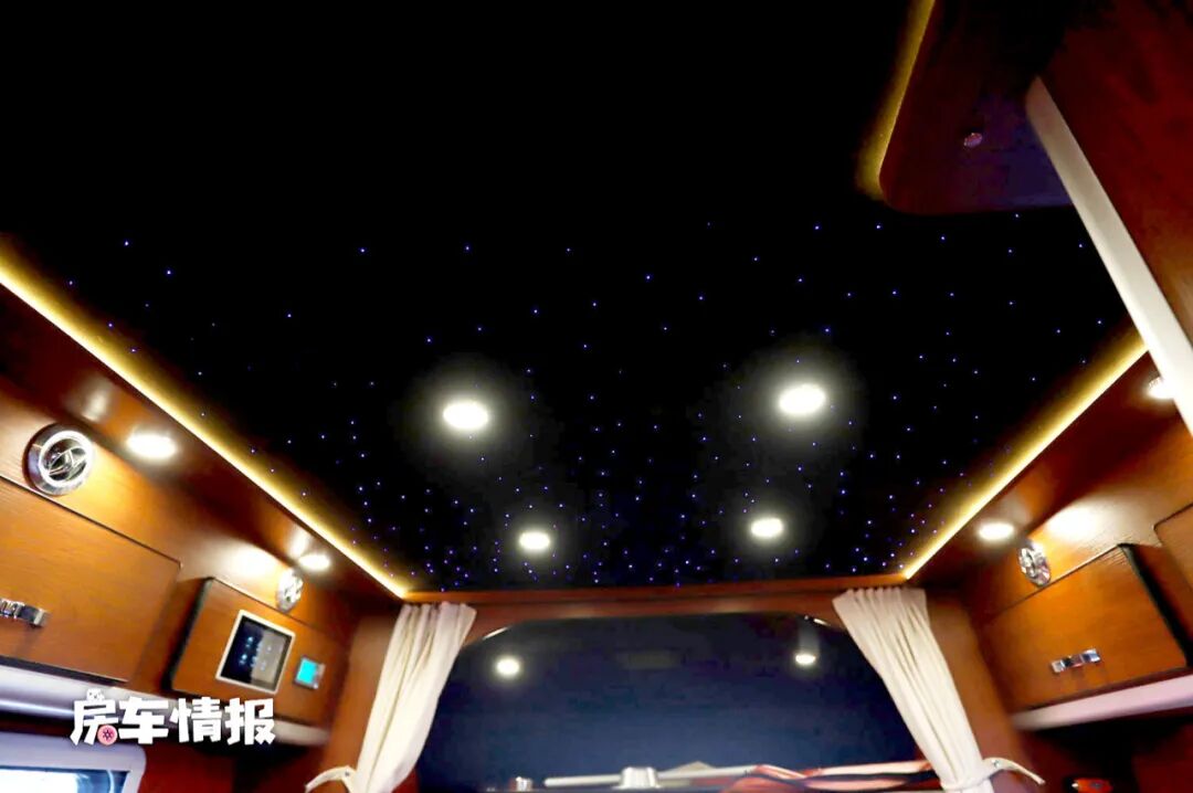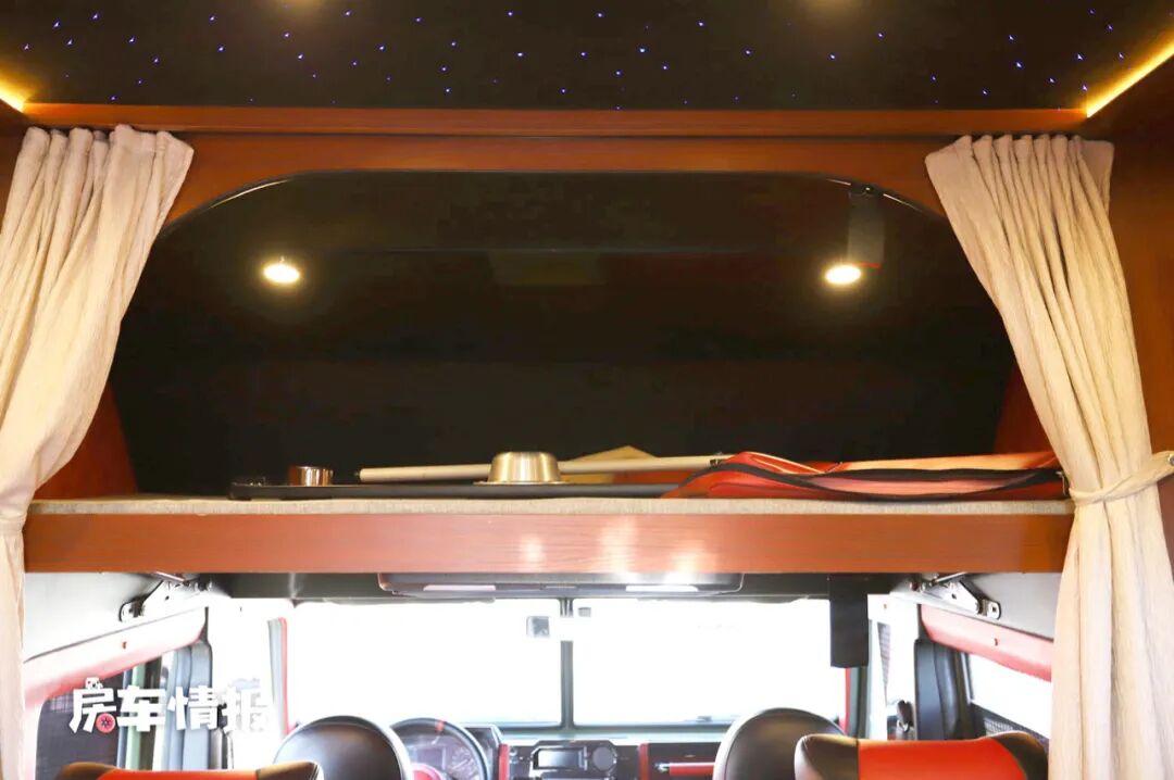 在驾驶室上方的空间里还提供了一个顶置的床铺,但是空间并不是很大,提供了床头照明灯和阅读灯,方便平时使用。此外,这款房车还配备了一台20寸的升降折叠液晶电视,平时可以追剧看综艺。