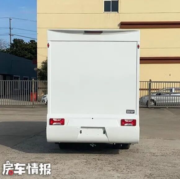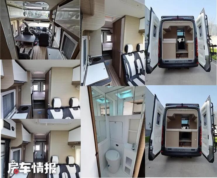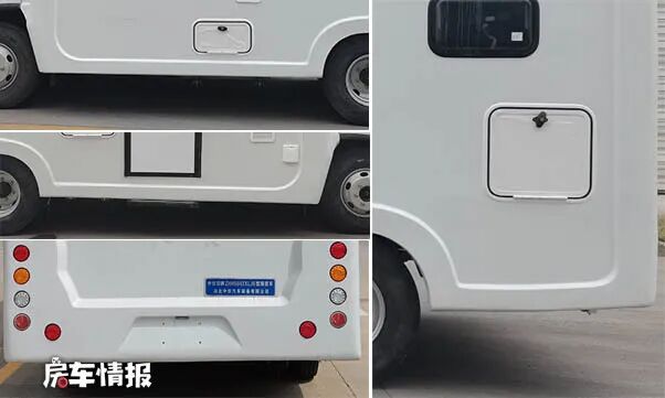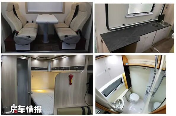 关于内饰部分,通过仅有的几张公示图可以看到,依然是采用了较为常见的布局,前方为会客区,采用双人正向座椅+餐桌的设计,车厢中部为厨卫区域,值得点赞的是卫生间内部表现挺不错,车尾的休息区采用的三折式的尾部横置双人床,将床板掀起就能变成一个比较大的储物通道。