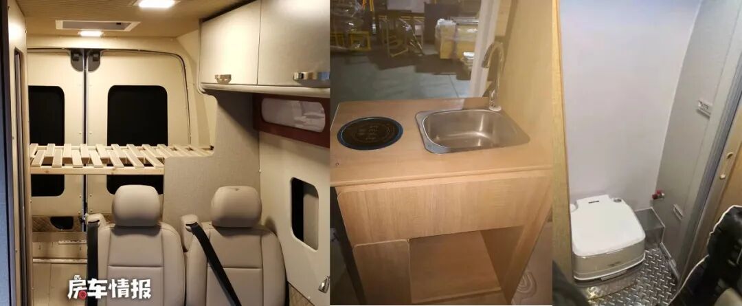 关于这款车的内部,属于中规中矩的设计,但由于采用的长轴底盘,内部空间要远大于短轴V80房车。车内采用四人对坐沙发,卫生间采用卷帘式设计,车尾部提供了一组上下床层床,可以满足一家3口人住宿。