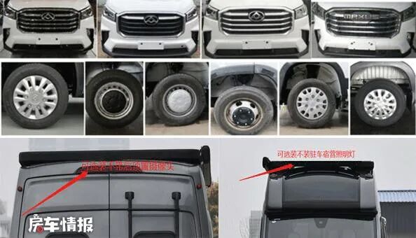 通过公示信息也可以看到车身外部提供了多项选装,如轮毂、车头进气中网以及车身颜色等,进一步提升了整车的实用性和个性化。车身尺寸方面,长宽高分别为5940*2110/2140*2835/2940mm,根据外部选装不同,车身宽度和高度会有所改变。