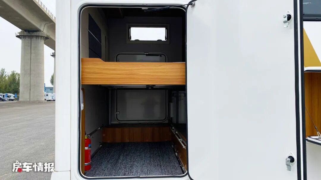 不过最大的亮点还是位于车厢尾部内高可达到1450mm的超大尺寸贯通式行李箱,而且这个行李箱并不是普普通通固死的形式,它还和内部的升降尾床有着紧密的联系,为什么这么说呢?是因为这辆车的内部配备了一张整体可升降的电动横置尾床,并且还带有一个可控制的面板,例如当我们按下其中的模式1时,床铺会达到一个合适的高度方便我们上下床睡觉;那按下模式2时,整张床都会上升至最顶部,这样与之相通的下方储物舱空间也就达到了一个峰值,诸如此类,用户可以根据自己行李的大小去调节尾床的高低,从而达到一个两全其美的状态。