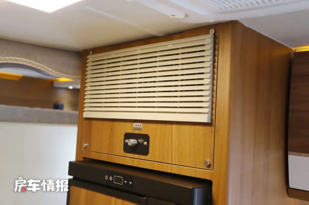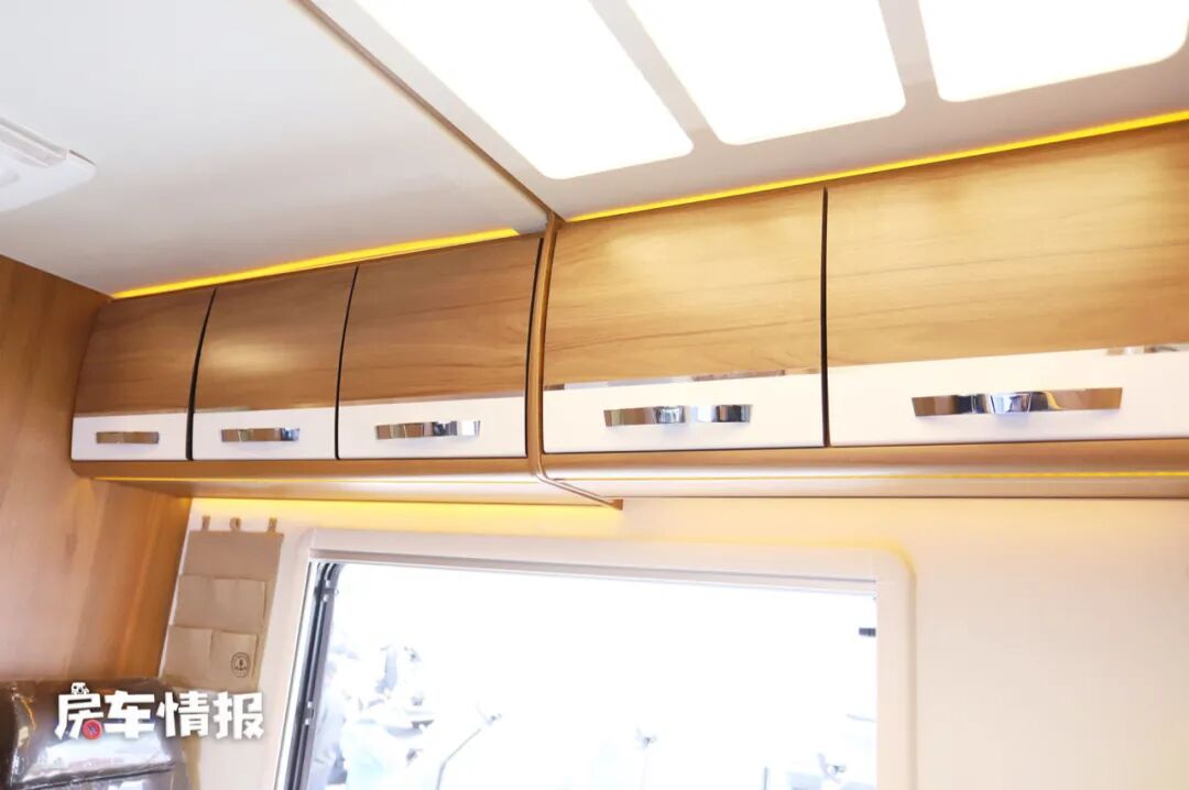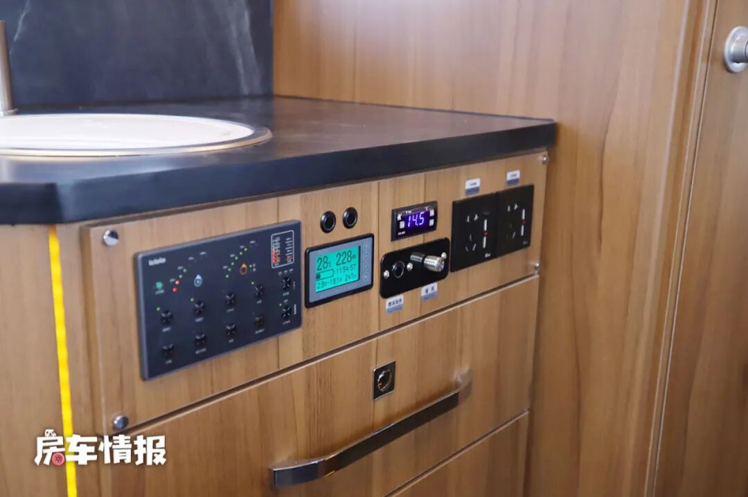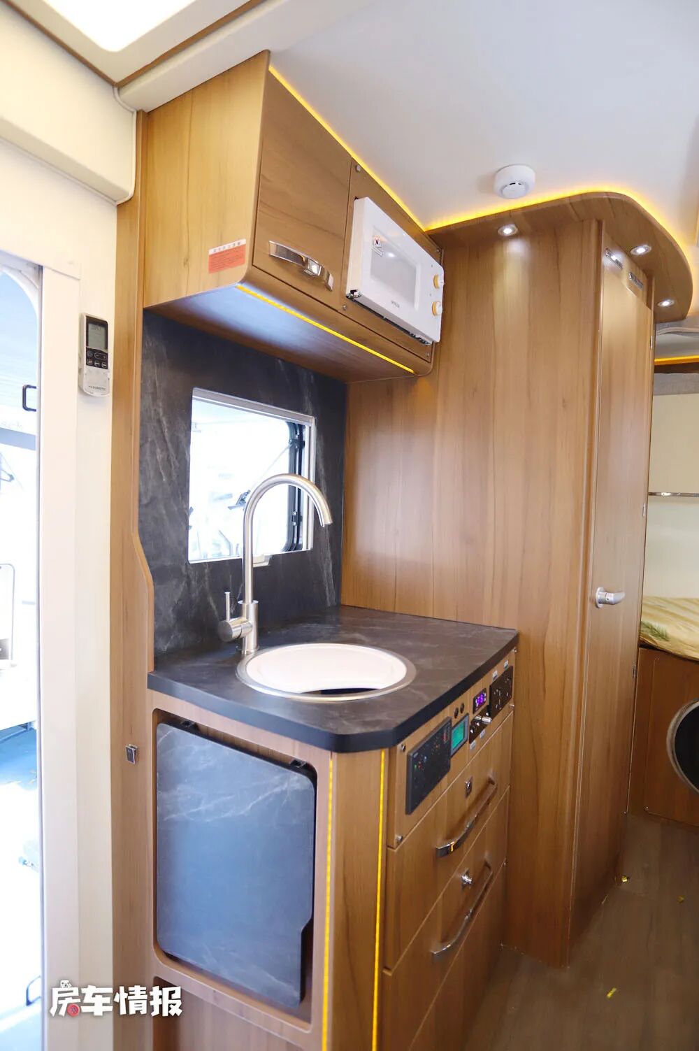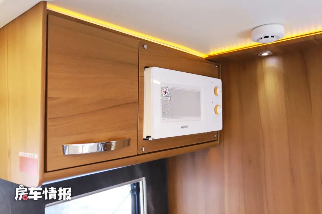台面下方提供了多个储物抽屉,而全车的水电控制面板也被安排在了这里,平时操作起来还是很方便的,上方提供了一个微波炉和储物吊柜。