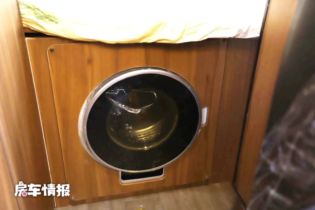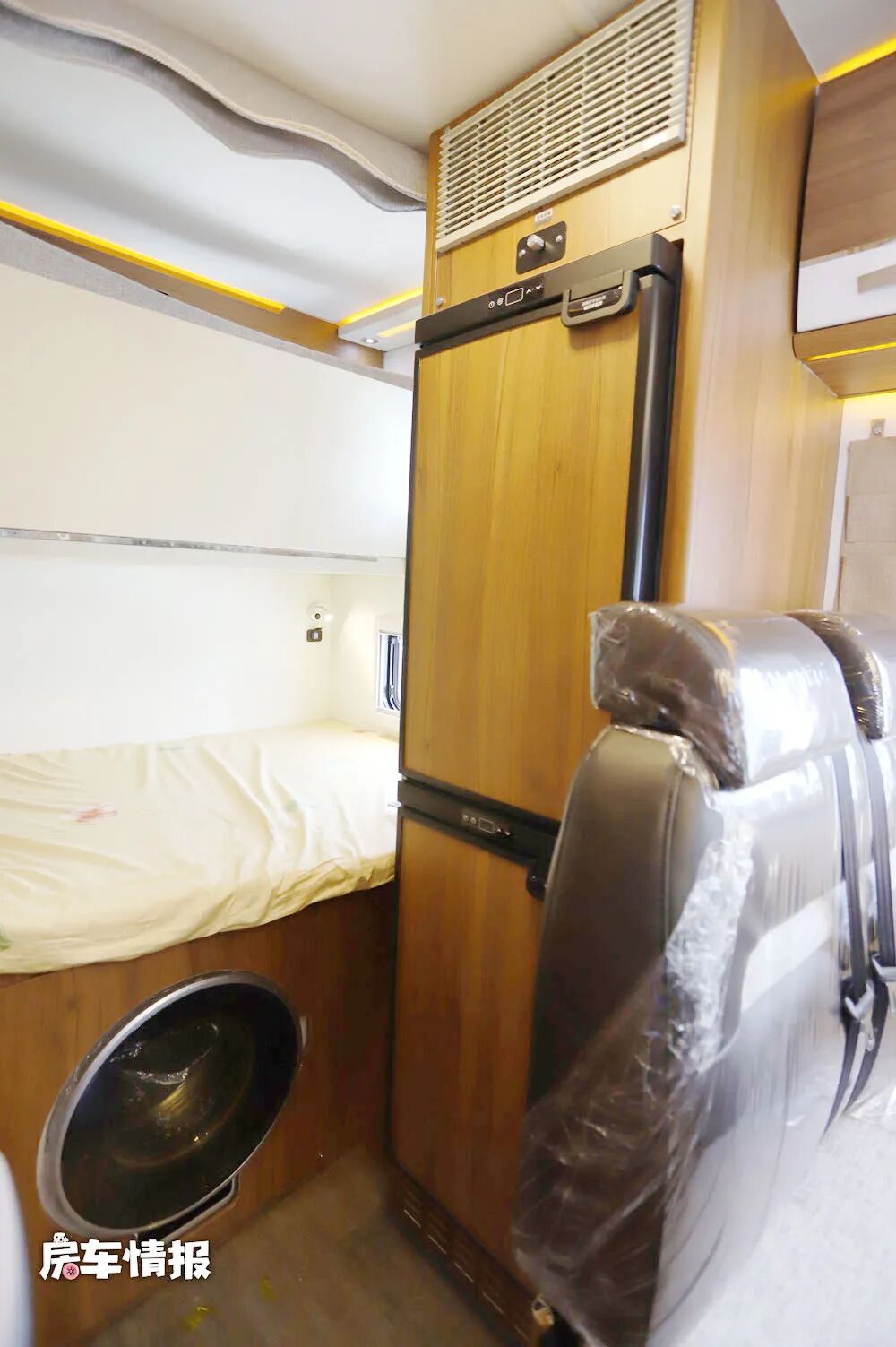 车厢尾部是两张上下的床铺,尺寸均为2130mm*1050mm,平时可以容纳两个成年人睡觉休息。床下还隐藏了一台小型的洗衣机,平时可以洗一些小型衣物。