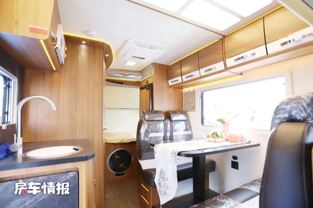 车厢内部整体的通透性还可以,内饰家具也采用了木质的装饰风格,配备了暖色的氛围灯,显得非常的温馨。