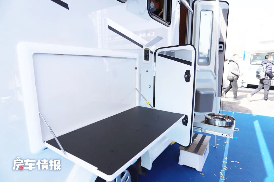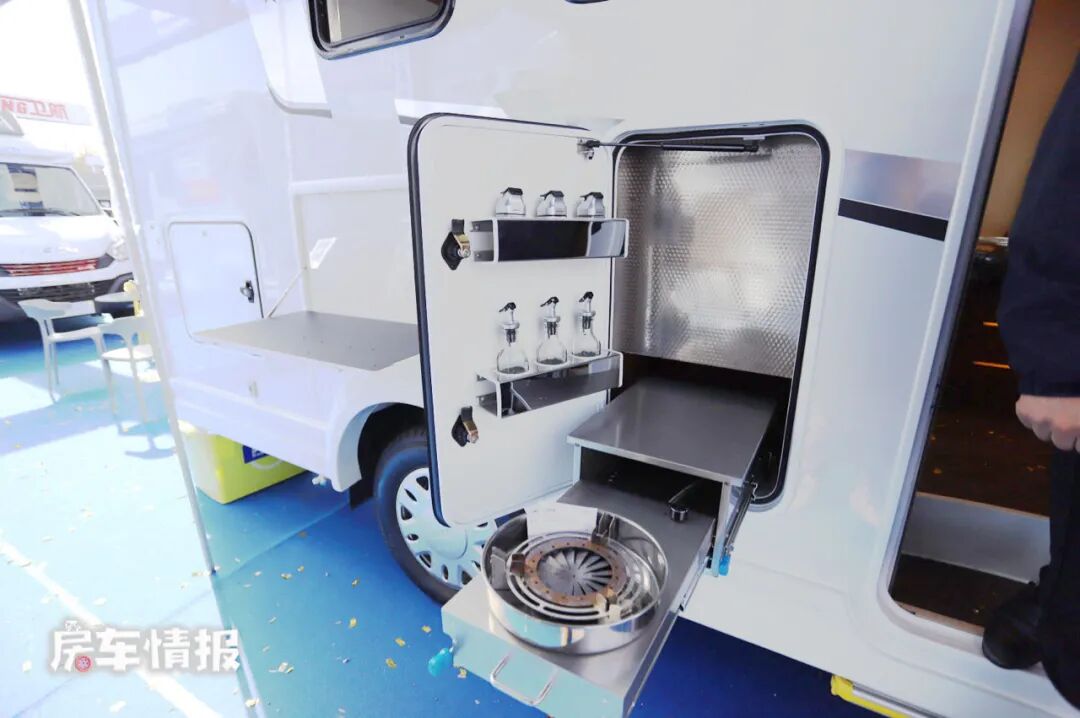 在车身的右侧上方提供了一台手动的遮阳棚,下方提供了一个下翻的置物桌板和外置抽拉灶台,门上还配备了两排置物托架,可以放一些料理瓶,不用担心平时行车时会倒,设计还是非常人性化且方便实用的。