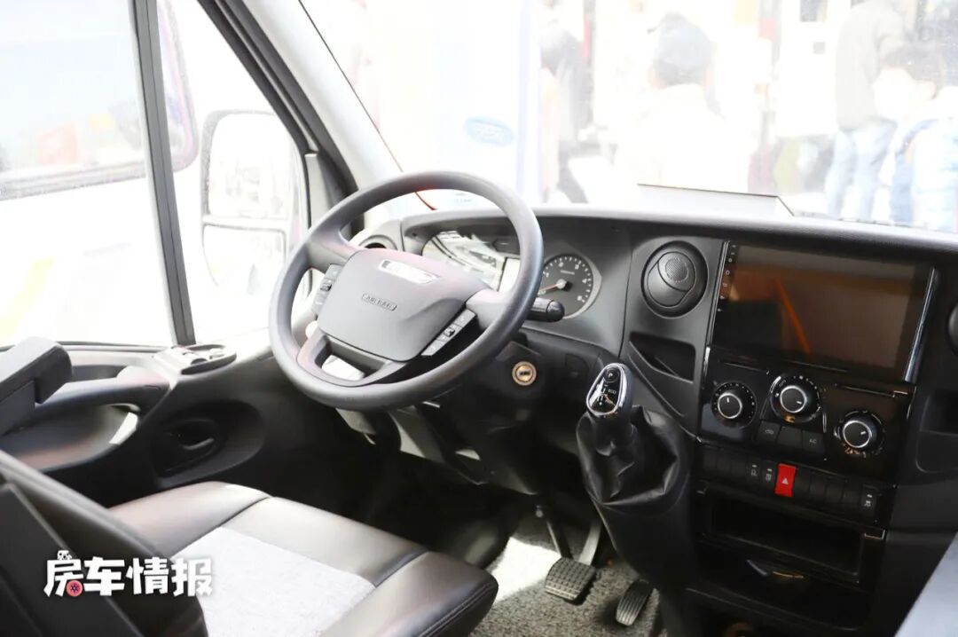 驾驶室内部的延用了原车的设计风格,配置了多功能方向盘和中控彩色显示大屏,方便平时操控。主副驾驶座椅采用了皮拼布艺的材质,并带有乘车扶手,乘坐起来也相对舒适。另外副驾驶座椅还提供了180度向后旋转的功能。