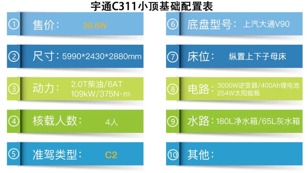 这款搭载大通V90底盘所打造的小顶设计的宇通C311,现在的官方指导价为39.8万元,不知道结合整体的配置,您觉得性价比如何呢?欢迎在下方的评论区和我们分享您对此车的看法和观点,下期再见~