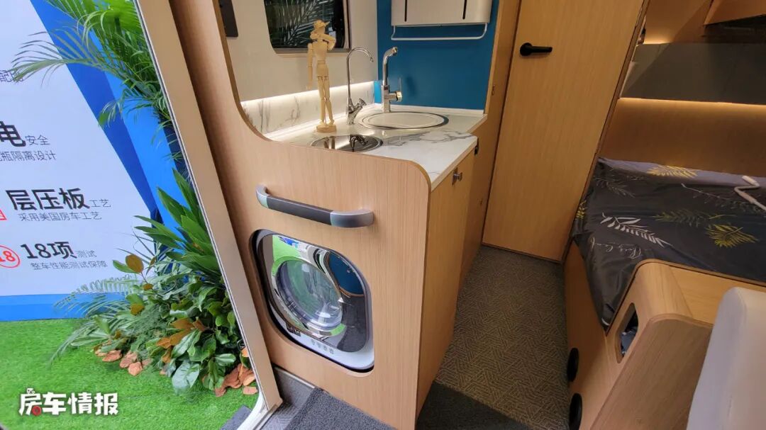 另外在厨房操作台的外侧还配置了一台小型的洗衣机,也能满足洗衣服的需求。