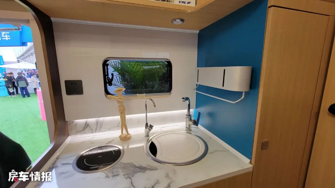 乘客门后方为全车的厨房区,整体的布局设计还是比较主流化的,台面上提供了电磁炉和不锈钢洗菜池,同时还提供了直饮水功能,更适合有小朋友的家庭使用。而全车的微波炉是被安放在了厨房区后方储物柜的上方。